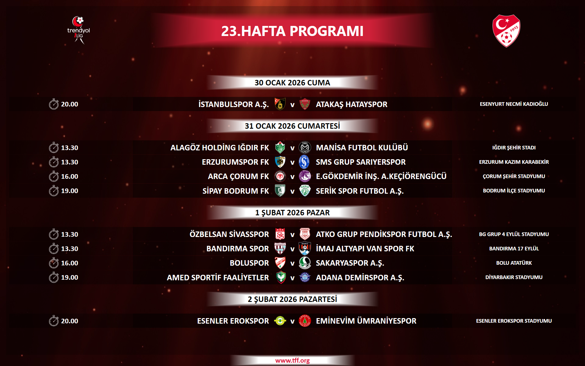 Trendyol 1. Lig'de 23-27. Hafta Programı Açıklandı 20.01.2026 Trendyol 1. Lig'de 23-27. hafta müsabakalarına ilişkin program açıklanmıştır.Saha bilgisi boş bırakılmış müsabakaların hangi stadyumda oynanacağı daha sonra ilan edilecektir.Karşılaşmaların programı şöyle: Diğer Haberler Haftanın Programı Trendyol 1. Lig'de 21. Hafta Müsabaka Görevlileri Açıklandı Gökmen Özdenak Anısına Saygı Duruşunda Bulunulacak Trendyol 1. Lig'de 20. Hafta Müsabaka Görevlileri Açıklandı Trendyol 1. Lig'de 19. Hafta Müsabaka Görevlileri Açıklandı Trendyol 1. Lig'de 20-22. Hafta Programı Açıklandı Trendyol 1. Lig'de 18. Haftanın 20-22 Aralık Müsabaka Görevlileri Açıklandı Trendyol 1. Lig'de 18. Haftanın 19 Aralık Müsabaka Görevlileri Açıklandı 2025-2026 Sezonu 2. Transfer ve Tescil Dönemi'nde Değişiklik FIFA Disiplin Komitesi'nden Adana Demirspor'a Puan Tenzili Cezası