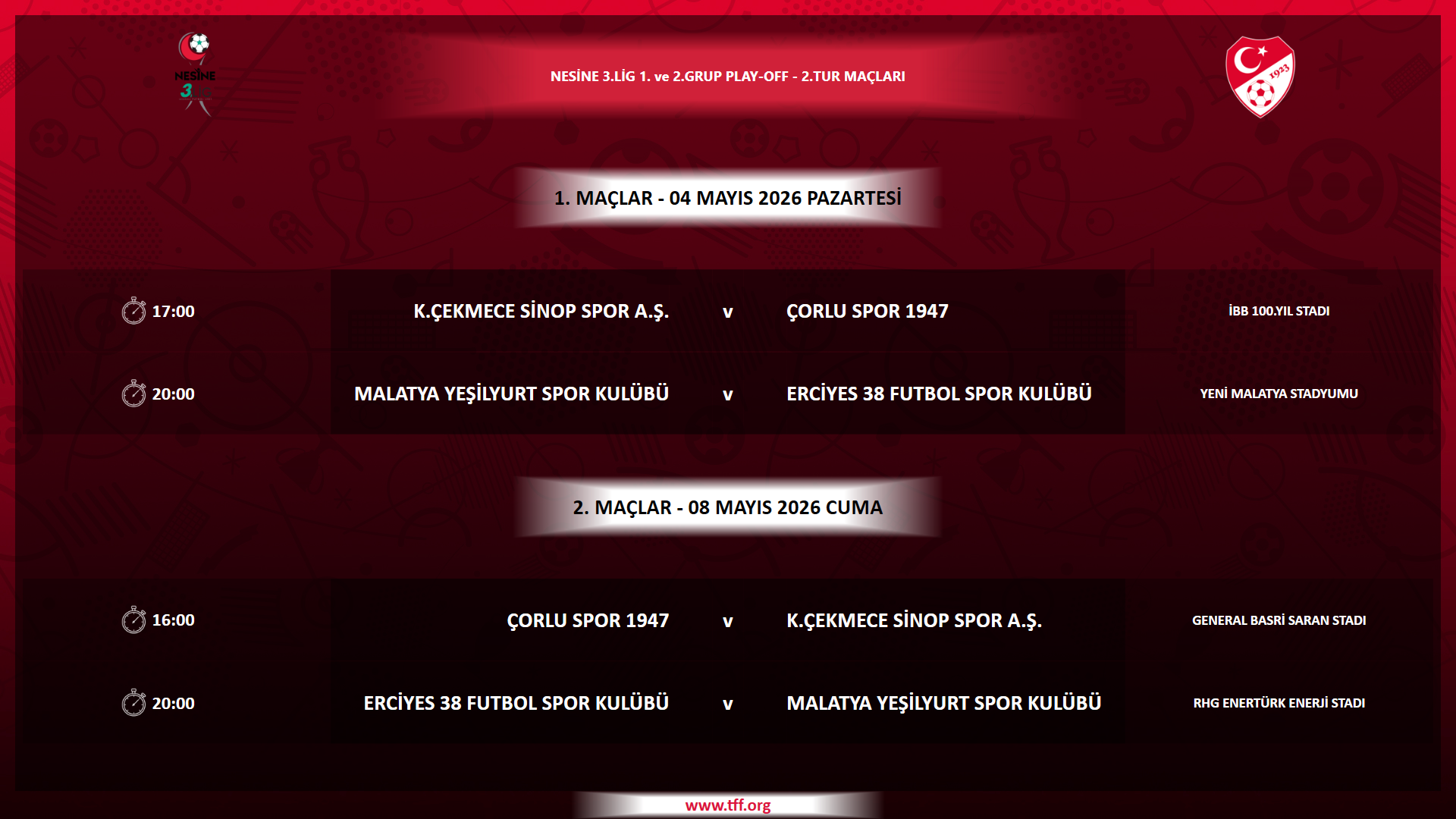 Nesine 3. Lig 1. ve 2. Grup Play-Off 2. Tur Programı Açıklandı 28.04.2026 Nesine 3. Lig 1. Grup ve 2. Grup play-off 2. tur müsabakalarına ilişkin program açıklanmıştır.Karşılaşmaların programı şöyle: Diğer Haberler Haftanın Programı Nesine 2. Lig ve Nesine 3. Lig'in Yayıncısı Tivibu Spor ve Yaay Oldu Nesine 3. Lig Play-Off 1. Tur 2. Maçlarının Müsabaka Görevlileri Açıklandı Nesine 3. Lig'de Play-Off 1. Tur İlk Maçlarının Müsabaka Görevlileri Açıklandı Nesine 3. Lig 2. Grup Play-Off 1. Tur Programı Açıklandı Nesine 2. Lig'e Yükselen Kütahyaspor Futbol Spor Kulübü Kupasını Aldı Nesine 2. Lig'e Yükselen Sebat Gençlik Spor Kupasını Aldı Nesine 3. Lig'de Play-Off 1. Tur Programları Açıklandı İnegöl Kafkas Spor Kulübü, Nesine 2. Lig'e Yükseldi Nesine 2. Lig'e Yükselen 12 Bingöl Spor, Kupasını Aldı