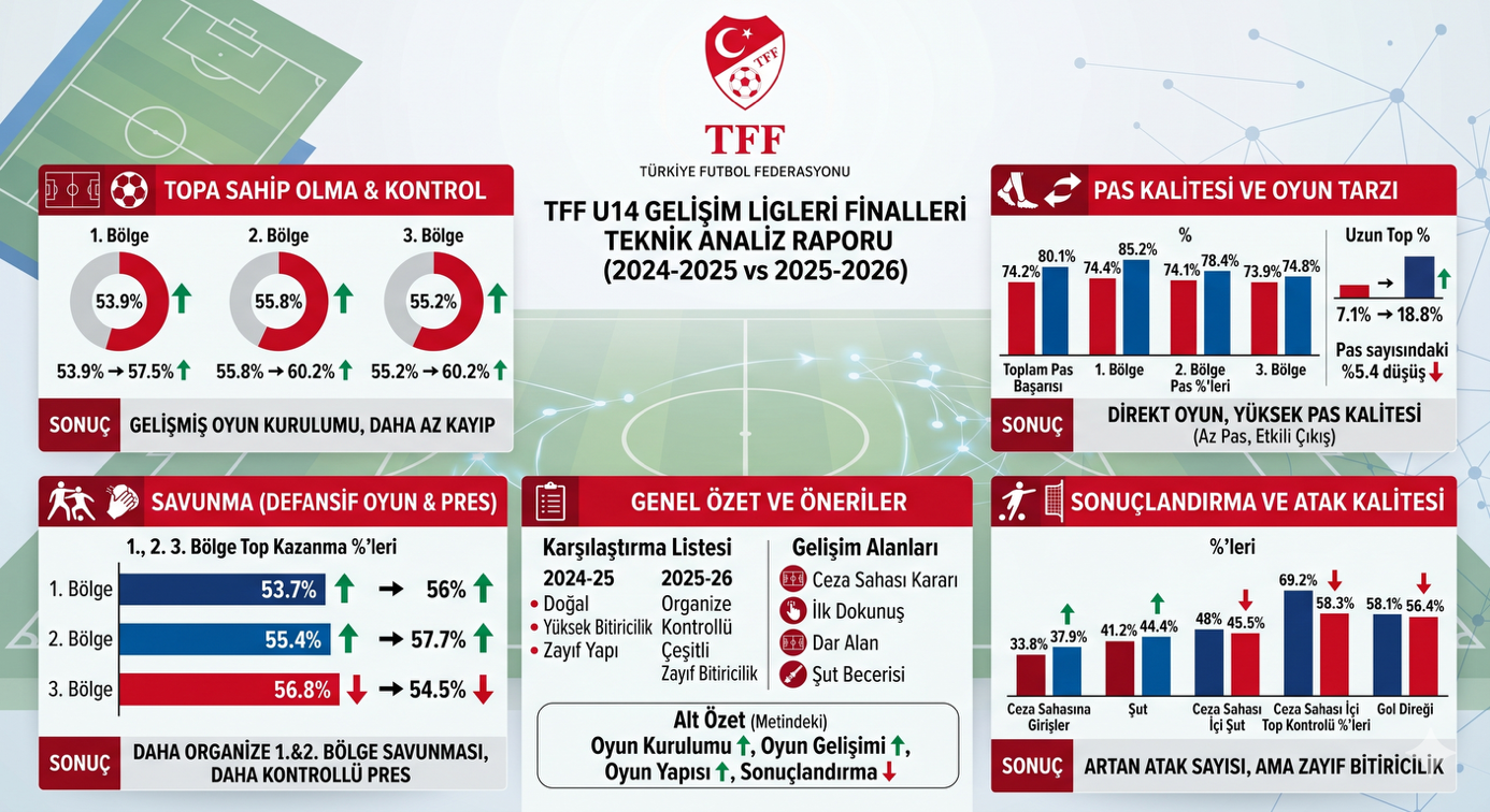 Türkiye Futbol Federasyonu Gelişim Ligi Direktörlüğü, 2024-2025 ve 2025-2026 U14 Gelişim Ligi Finallerinde oynanan müsabakaları kapsayan veriler ışığında; oyun yapısındaki değişimleri, teknik gelişim grafiklerini ve gelecek projeksiyonlarını mercek altına aldı.