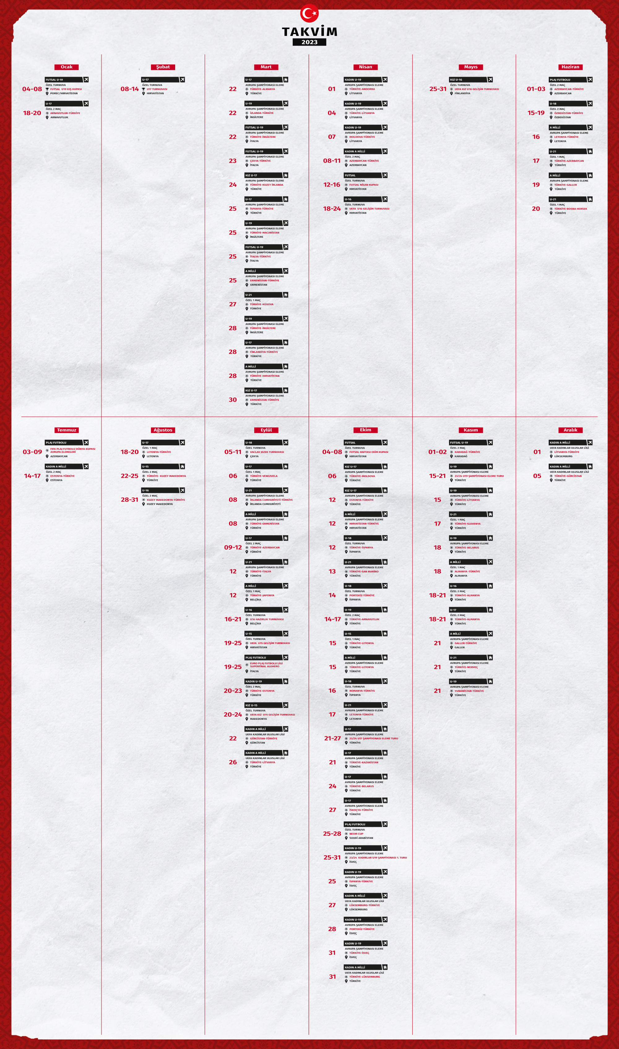 Haftanın Programı Trendyol Süper Lig 9. hafta müsabakaları 21, 22 ve 23 Ekim'de, Trendyol 1. Lig 9. hafta müsabakaları 21, 22 ve 23 Ekim'de, TFF 2. Lig 10. hafta müsabakaları 22 Ekim'de, TFF 3....... Ziraat Türkiye Kupası 3. Eleme Turu Kura Çekimi Yapıldı Ziraat Türkiye Kupası 3. Eleme Turu Kura Çekimi bugün TFF Riva Hasan Doğan Milli Takımlar Kamp ve Eğitim Tesisleri'nde gerçekleştirildi.... TÜRKİYE 4-0 LETONYAMutluyuz, Gururluyuz, EURO 2024 Finallerindeyiz A Millî Takımımız, UEFA EURO 2024 Elemeleri D Grubu 7. maçında Konya'da Letonya'yı 4-0 yenerek Almanya'daki finallere adını yazdırdı. Teşekkürler... Disiplin Sevkleri - 19.10.2023 Hukuk Müşavirliği’nce 19.10.2023 tarihinde Profesyonel Futbol Disiplin Kurulu’na yapılan sevk raporları aşağıda belirtilmiştir. Kadınlar 3. Ligi Play-In 5. Tur Kura Çekimi Yapıldı Kadınlar 3. Liginden Kadınlar 2. Ligine yükselecek 4 takımın daha belirleneceği play-in müsabakalarına dair 5. tur kura çekimi 19 Ekim 2023 tarihinde online olarak gerçekleştirildi. Kadınlar 2. Ligi'ne Yükselen 8 Takım Belli Oldu Kadınlar 3. Ligi Play-In 4. Tur müsabakaları 18.10.2023 tarihinde tarafsız sahalarda oynandı ve karşılaşmaları kazanan 8 takım Kadınlar 2. Ligine yükseldi. Ziraat Türkiye Kupası 3. Tur Müsabaka Programı Açıklandı Ziraat Türkiye Kupası 3. Tur müsabakalarına ilişkin program açıklandı. Üçüncü turda müsabakalar 31 Ekim, 1 ve 2 Kasım tarihlerinde oynanacak. Muş 1984 Muşspor - Çatalcaspor Maçında Gözlemci Değişikliği TFF 3. Ligin 4. Grup 7. haftasında Muş 1984 Muşspor ile Çatalcaspor takımları arasında oynanacak olan müsabakanın gözlemcisinde değişiklik yapılmıştır. U19 Kadın Milli Takımı'nın Avrupa Şampiyonası A Ligi Kadrosu Açıklandı U19 Kadın Milli Takımımızın 25-31 Ekim 2023 tarihleri arasında İsveçte oynayacağı UEFA U19 Avrupa Şampiyonası A Ligi 1. Tur müsabakalarının kadrosu açıklandı. 2023-2024 Sezonu U16, U15 ve U14 Gelişim Ligleri Başvuruları Sona Eriyor TFF Yönetim Kurulunun 04.10.2023 tarih ve 21 sayılı toplantısında kabul edilen U16-U15-U14 Gelişim Ligleri Statüsü, 12.10.2023 tarihinde www.tff.orgda yayınlanmıştı. Dijital Atamayla Belirlenen TFF 2. ve 3. Lig'de Haftanın Hakemleri Açıklandı TFF 2. Ligin 10. hafta karşılaşmalarında ve TFF 3. Ligin 7. hafta karşılaşmalarında görev yapacak hakemler ve yardımcıları Dijital Atama Yöntemi ile belirlenmiştir. Dijital Atamayla Belirlenen Trendyol Süper Lig 9. Hafta Hakemleri Açıklandı Trendyol Süper Ligin 9. hafta müsabakalarında görev yapacak hakemler ve yardımcıları Dijital Atama Yöntemi ile belirlenmiştir. Dijital Atamayla Belirlenen Trendyol 1. Lig 9. Hafta Hakemleri Açıklandı Trendyol 1. Ligin 9. hafta müsabakalarında görev yapacak hakemler ve yardımcıları Dijital Atama Yöntemi ile belirlenmiştir. TÜM HABERLER İÇİN TIKLAYINIZ... MİLLİ MAÇ TAKVİMİ LİGLERDE SEZON PLANLAMASI TFF SOSYAL YARDIM VE DAYANIŞMA VAKFI SATIN ALMA İLANLARI TFF LOGO KULLANIMLARI TFF İLETİŞİM BİLGİLERİ