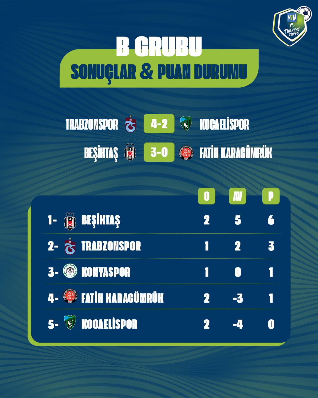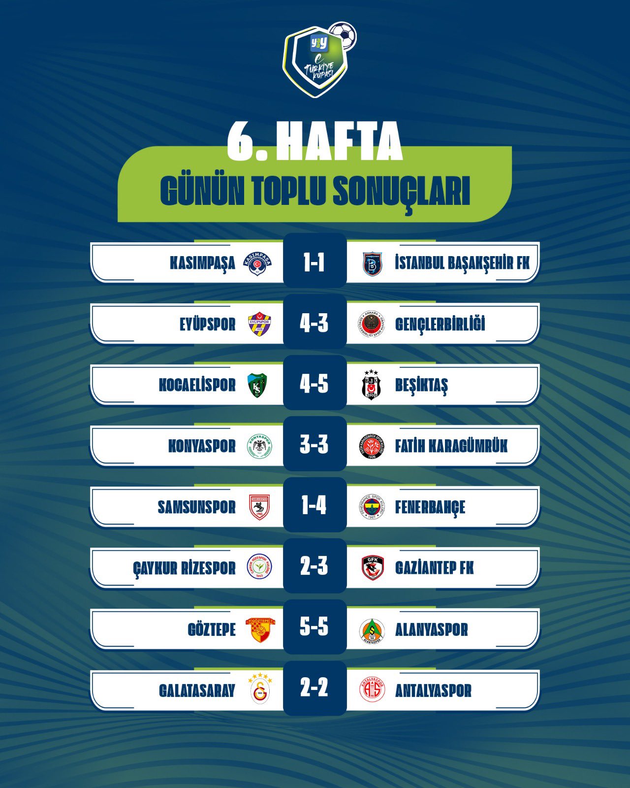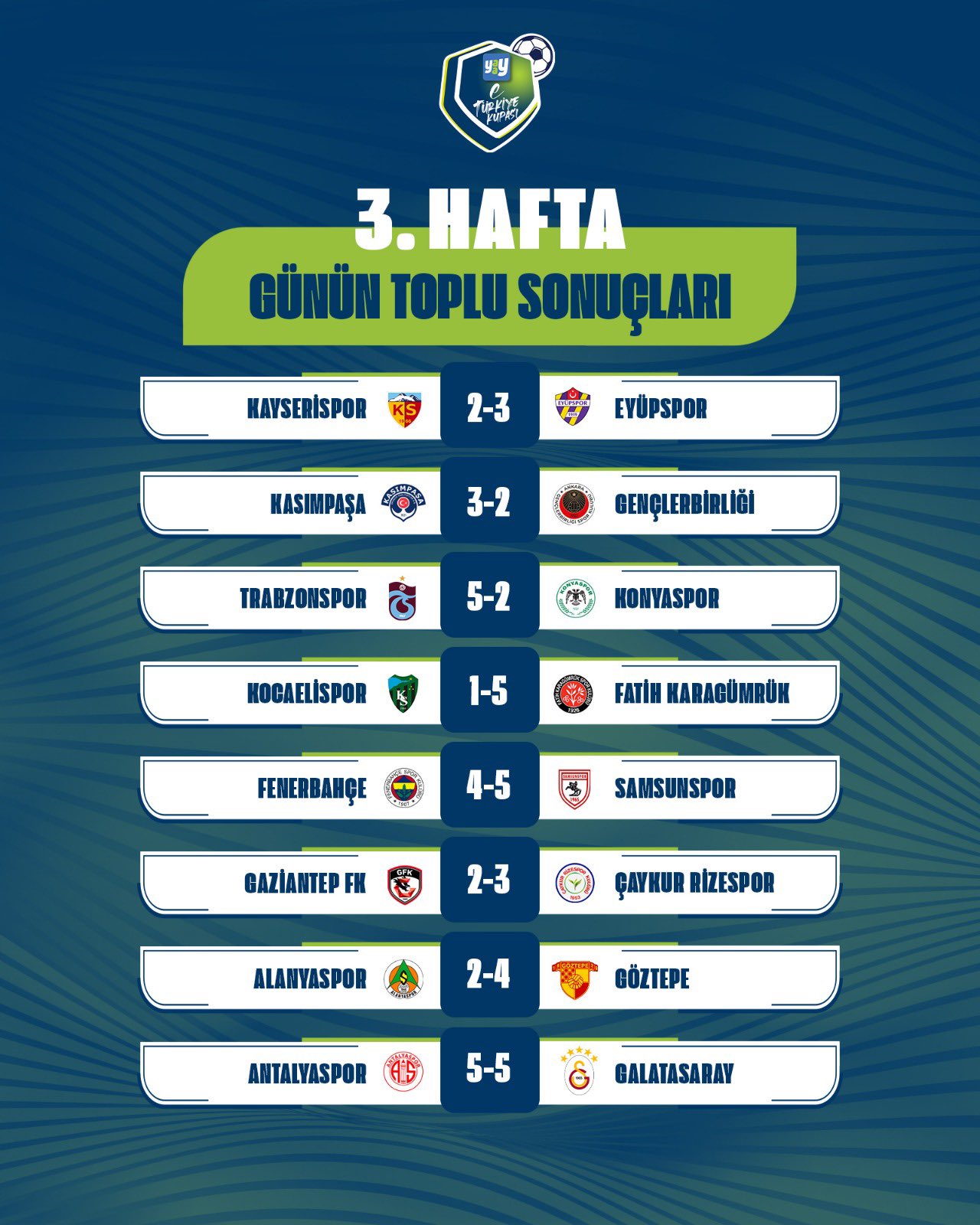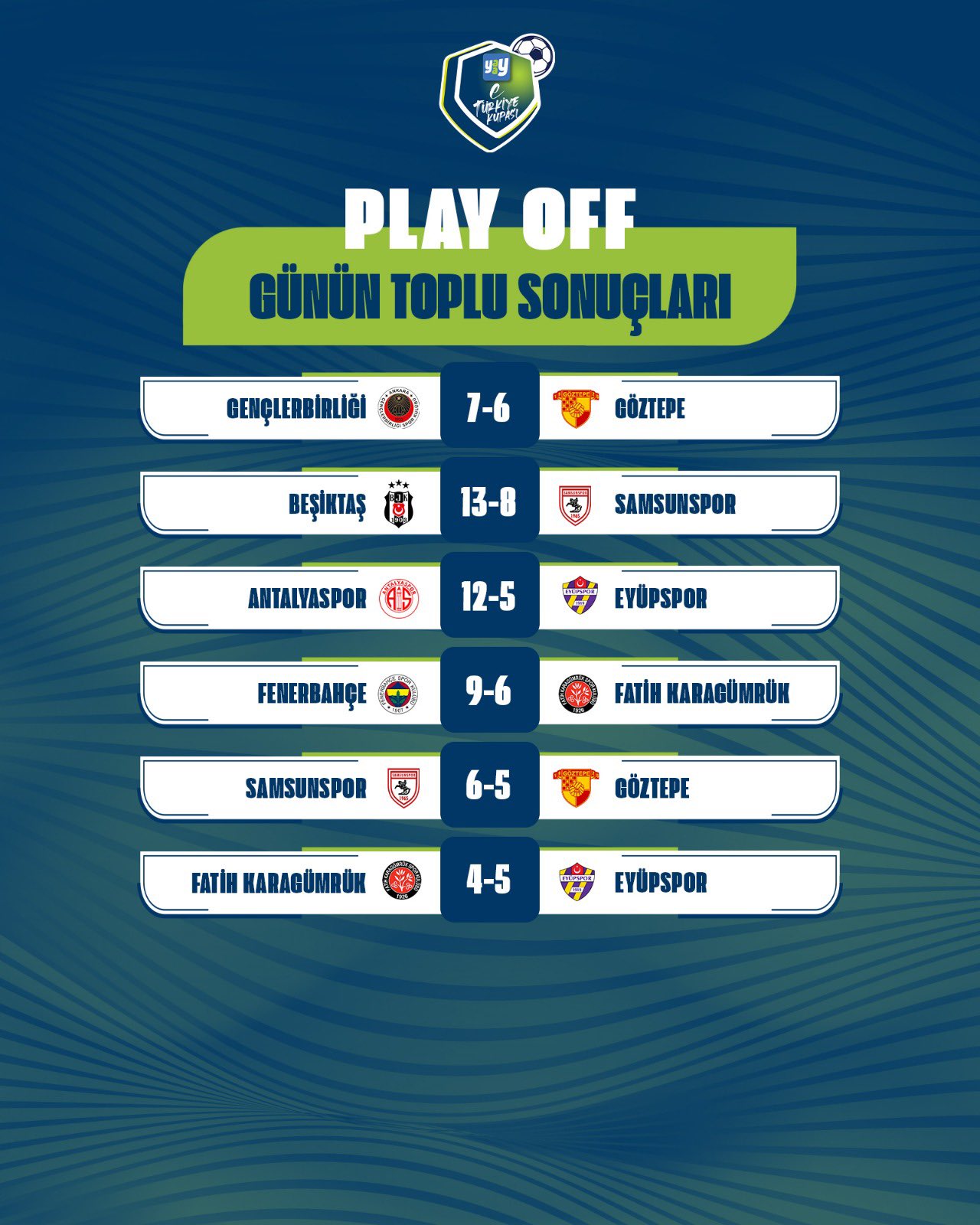 Yaay eTürkiye Kupası FinalleriYaay eTürkiye Kupası Play-Off Turu 1. gün toplu sonuçları için tıklayınızYaay eTürkiye Kupası Play-Off Turu 2. gün toplu sonuçları için tıklayınızYaay eTürkiye Kupası Toplu SonuçlarıYaay eTürkiye Kupası 1. hafta toplu sonuçları için tıklayınızYaay eTürkiye Kupası 2. hafta toplu sonuçları için tıklayınızYaay eTürkiye Kupası 3. hafta toplu sonuçları için tıklayınızYaay eTürkiye Kupası 4. hafta toplu sonuçları için tıklayınızYaay eTürkiye Kupası 5. hafta toplu sonuçları için tıklayınızYaay eTürkiye Kupası 6. hafta toplu sonuçları için tıklayınızYaay eTürkiye Kupası 7. ile 8. hafta toplu sonuçları için tıklayınızYaay eTürkiye Kupası 9. ile 10. hafta toplu sonuçları için tıklayınızYaay eTürkiye Kupası A GrubuYaay eTürkiye Kupası A Grubu 1. hafta sonuçları ve puan cetveli için tıklayınızYaay eTürkiye Kupası A Grubu 2. hafta sonuçları ve puan cetveli için tıklayınızYaay eTürkiye Kupası A Grubu 3. hafta sonuçları ve puan cetveli için tıklayınızYaay eTürkiye Kupası A Grubu 4. hafta sonuçları ve puan cetveli için tıklayınızYaay eTürkiye Kupası A Grubu 5. hafta sonuçları ve puan cetveli için tıklayınızYaay eTürkiye Kupası A Grubu 6. hafta sonuçları ve puan cetveli için tıklayınızYaay eTürkiye Kupası A Grubu 7. ile 8. hafta sonuçları ve puan cetveli için tıklayınızYaay eTürkiye Kupası A Grubu 9. ile 10. hafta sonuçları ve puan cetveli için tıklayınızYaay eTürkiye Kupası B GrubuYaay eTürkiye Kupası B Grubu 1. hafta sonuçları ve puan cetveli için tıklayınızYaay eTürkiye Kupası B Grubu 2. hafta sonuçları ve puan cetveli için tıklayınızYaay eTürkiye Kupası B Grubu 3. hafta sonuçları ve puan cetveli için tıklayınızYaay eTürkiye Kupası B Grubu 4. hafta sonuçları ve puan cetveli için tıklayınızYaay eTürkiye Kupası B Grubu 5. hafta sonuçları ve puan cetveli için tıklayınızYaay eTürkiye Kupası B Grubu 6. hafta sonuçları ve puan cetveli için tıklayınızYaay eTürkiye Kupası B Grubu 7. ile 8. hafta sonuçları ve puan cetveli için tıklayınızYaay eTürkiye Kupası B Grubu 9. ile 10. hafta sonuçları ve puan cetveli için tıklayınızYaay eTürkiye Kupası C GrubuYaay eTürkiye Kupası C Grubu 1. hafta sonuçları ve puan cetveli için tıklayınızYaay eTürkiye Kupası C Grubu 2. hafta sonuçları ve puan cetveli için tıklayınızYaay eTürkiye Kupası C Grubu 3. hafta sonuçları ve puan cetveli için tıklayınızYaay eTürkiye Kupası C Grubu 4. hafta sonuçları ve puan cetveli için tıklayınızYaay eTürkiye Kupası C Grubu 5. hafta sonuçları ve puan cetveli için tıklayınızYaay eTürkiye Kupası C Grubu 6. hafta sonuçları ve puan cetveli için tıklayınızYaay eTürkiye Kupası D GrubuYaay eTürkiye Kupası D Grubu 1. hafta sonuçları ve puan cetveli için tıklayınızYaay eTürkiye Kupası D Grubu 2. hafta sonuçları ve puan cetveli için tıklayınızYaay eTürkiye Kupası D Grubu 3. hafta sonuçları ve puan cetveli için tıklayınızYaay eTürkiye Kupası D Grubu 4. hafta sonuçları ve puan cetveli için tıklayınızYaay eTürkiye Kupası D Grubu 5. hafta sonuçları ve puan cetveli için tıklayınızYaay eTürkiye Kupası D Grubu 6. hafta sonuçları ve puan cetveli için tıklayınız