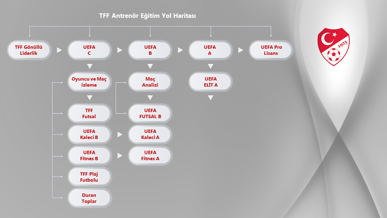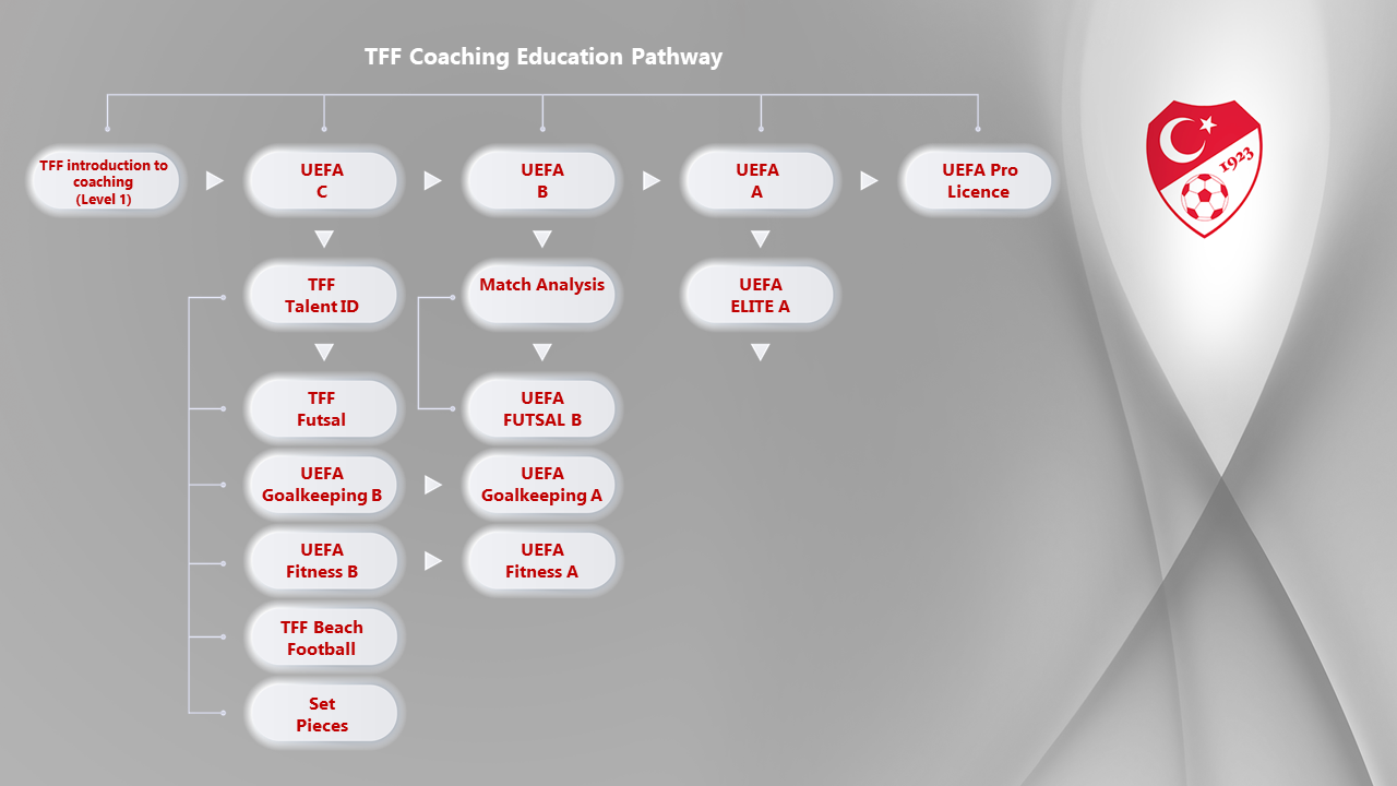 | Türkiye Futbol Federasyonu Futbol Gelişim Direktörlüğü'nün en önemli görevlerinden biri antrenör eğitimidir. Türkiye Futbol Federasyonu, 2008 yılının Aralık ayından bu yana "JIRA" Konvansiyonu tam üyesidir. Bu çerçevede TFF uluslararası geçerliliği olan antrenörlük diploması verme yetkisine sahiptir. TFF Futbol Gelişim Direktörlüğü güncel metodolojiler kullanarak ve teknolojik enstrümanlardan yararlanarak günümüz antrenör profiline uygun teknik adamları yetiştiren antrenör kursları düzenlemektedir. Bunun yanında FIFA ve UEFA ile düzenli iletişim kurularak yeni antrenör eğitimleri takip edilmekte ve bu eğitimler TFF programlarına eklenmektedir. |