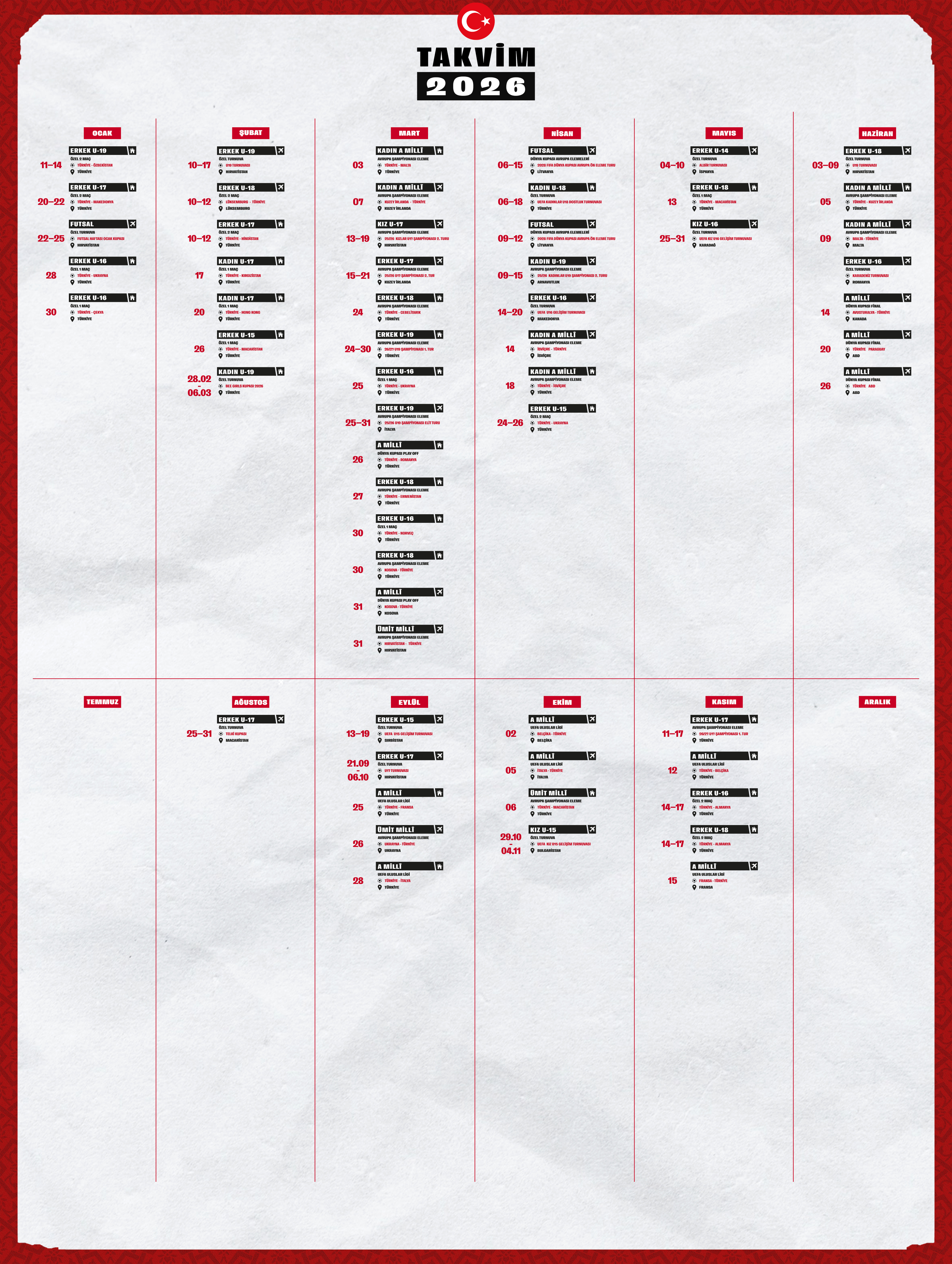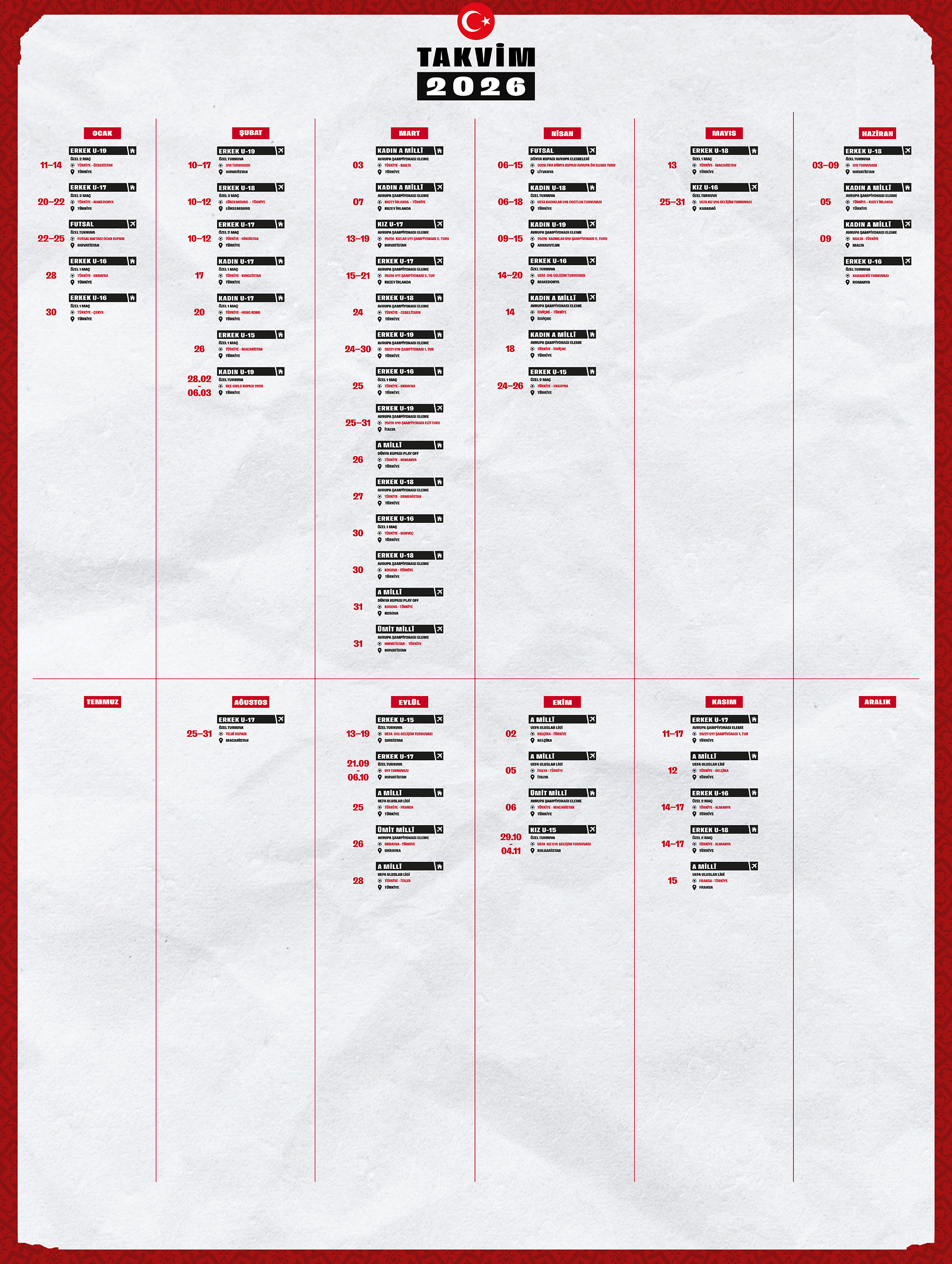Vincenzo Montella'dan Samsunspor'a Ziyaret A Millî Takım Teknik Direktörümüz Vincenzo Montella, kulüplere yaptığı ziyaretler kapsamında Samsunspor'un misafiri oldu.... Haftanın Programı Trendyol Süper Lig Mehmet Ali Yılmaz Sezonu 26. hafta müsabakaları 13, 14 ve 15 Mart'ta, Trendyol 1. Lig 30. hafta müsabakaları 10, 11 ve 12 Mart'ta, Trendyol 1. Lig 31. hafta müsabakaları 14, 15 ve 1...... Ziraat Türkiye Kupası Çeyrek ve Yarı Final Kura Çekimi Yapıldı Ziraat Türkiye Kupası Çeyrek ve Yarı Final Kura Çekimi, İstanbul Finans Merkezi'nde düzenlenen törenle yapıldı.... Trendyol Süper Lig'de 26. Haftanın 14 ve 15 Mart Müsabaka Görevlileri Açıklandı Trendyol Süper Lig Mehmet Ali Yılmaz Sezonu’nun 26. haftasında 14 Mart Cumartesi ve 15 Mart Pazar günleri oynanacak olan maçların müsabaka görevlileri belirlenmiştir. Trendyol 1. Lig'de 31. Hafta Müsabaka Görevlileri Açıklandı Trendyol 1. Lig’de 31. hafta maçlarının müsabaka görevlileri belirlenmiştir. Nesine 2. Lig ve Nesine 3. Lig'de Haftanın Müsabaka Görevlileri Açıklandı Nesine 2. Lig Kırmızı Grup’ta 28. hafta maçları, Nesine 2. Lig Beyaz Grup’ta 31. hafta maçları ve Nesine 3. Lig’de 25. hafta maçlarının müsabaka görevlileri belirlenmiştir. Trendyol Süper Lig'de 26. Haftanın 13 Mart Müsabaka Görevlileri Açıklandı Trendyol Süper Lig Mehmet Ali Yılmaz Sezonu’nun 26. haftasında 13 Mart Cuma günü oynanacak olan maçların müsabaka görevlileri belirlenmiştir. Prof. Dr. Ali Oktay Çokyüksel'i Kaybettik Türkiye Futbol Federasyonu eski yönetim kurulu üyesi ve Beşiktaş Divan Kurulu eski başkanı Prof. Dr. Ali Oktay Çokyüksel’in vefatını derin bir üzüntü ile öğrenmiş bulunuyoruz. Tahkim Kurulu Kararları - 11.03.2026 TFF Tahkim Kurulu 11 Mart 2026 günlü (19) sayılı toplantısında gündemindeki dosyaları inceleyerek aşağıdaki kararları almıştır. İhale İlanı Türkiye Futbol Federasyonu tarafından "Türkiye Futbol Federasyonu Hasan Doğan Millî Takımlar Kamp ve Eğitim Tesisleri Spor Salonu Yapım İşi" ihalesi düzenlenecektir. Trendyol 1. Lig'de 30. Haftanın 12 Mart Müsabaka Görevlileri Açıklandı Trendyol 1. Lig’in 30. haftasında 12 Mart Perşembe günü oynanacak olan maçların müsabaka görevlileri belirlenmiştir. Kamuoyuna Duyuru A Millî Takımımızın yurt içi ve yurt dışında oynayacağı tüm müsabakaların biletlerinin satışlarına ilişkin bilgiler, www.tff.org resmî internet sitesinden paylaşılmaktadır. FIFA Disiplin Komitesi'nden Adana Demirspor Kulübü'ne Puan Tenzili Cezası FIFA Disiplin Komitesi tarafından Adana Demirspor Kulübü’ne toplam 1 dosyadan 6 puan tenzili cezası uygulanmıştır. TÜM HABERLER İÇİN TIKLAYINIZ... MİLLİ MAÇ TAKVİMİ LİGLERDE SEZON PLANLAMASI TFF SOSYAL YARDIM VE DAYANIŞMA VAKFI SATIN ALMA İLANLARI TFF LOGO KULLANIMLARI TFF İLETİŞİM BİLGİLERİ