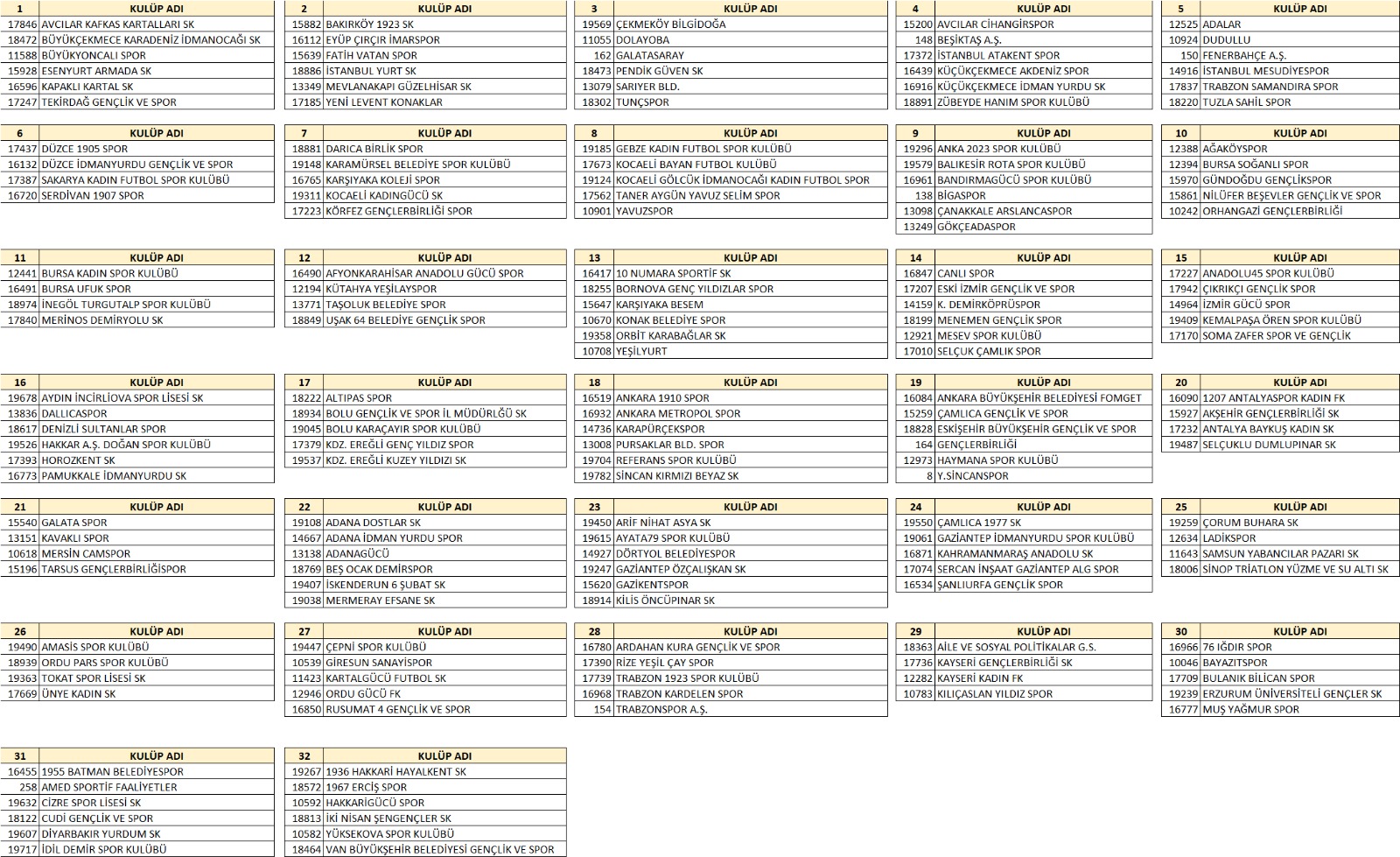 U17 Kızlar Gelişim Ligi 10 Ocak'ta Başlayacak 12.12.2025 U17 Kızlar Gelişim Ligi'nde 2025-2026 sezonu planlaması belli oldu. U17 Kızlar Gelişim Ligi'nin başlangıç tarihi 5 ve 6'lı gruplar için 10 Ocak, 4'lü gruplar için ise 17 Ocak olarak belirlenmiştir. Düzenlemeye göre; U17 Kızlar Gelişim Ligi coğrafi dağılıma ve illerdeki takım sayısına göre 32 grupta oynanacak. Cumartesi günü oynanması planlanan ligde müsabakalar çift devre lig usulünde gerçekleştirilecek. 2025-2026 Sezonu TFF U17 Kızlar Gelişim Ligi Genel Esasları için tıklayınız TFF U17 Kızlar Gelişim Ligi Grupları için tıklayınız TFF U17 Kızlar Gelişim Ligi Maç Haftaları için tıklayınız TFF U17 Kızlar Gelişim Ligi 1. Grup Play-off Yol Haritası için tıklayınız TFF U17 Kızlar Gelişim Ligi 2. Grup Play-off Yol Haritası için tıklayınız TFF U17 Kızlar Gelişim Ligi 3. Grup Play-off Yol Haritası için tıklayınız TFF U17 Kızlar Gelişim Ligi 4. Grup Play-off Yol Haritası için tıklayınız Diğer Haberler Kadın Futbol 1. Ligi Play-Off Finali 17 Mayıs'ta oynanacak Beylerbeyi Spor A.Ş. Pendik Çamlıkspor Şampiyonluk Kupasını Aldı Turkcell Kadın Futbol Süper Ligi'nde Çeyrek Finalistler Belli Oldu Kadınlar 1. Ligi'nde Play-Off Programı Açıklandı Turkcell Kadın Futbol Süper Ligi'nde Play-off ve Play-out Programı Açıklandı Gaziantep ALG Spor ve Beşiktaş Depremzedeler İçin Omuz Omuza Veriyor Kadın Futbol Liglerinde Play-Off Takvimi Belli Oldu Turkcell Kadın Futbol Süper Ligi'nde Haftanın Görünümü Kadınlar 3. Ligi Başlıyor Turkcell Kadın Futbol Süper Ligi'nde Haftanın Görünümü [ «« ] [ « ]28 - 29 - 30 - 31 - 32 - 33 - 34 - 35 - 36 - 37[ » ] [ »» ]
