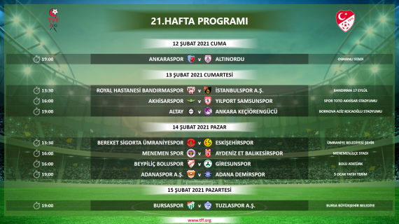 TFF 1. Lig 18-27. hafta programları açıklandı 14.01.2021 2020-2021 Sezonu TFF 1. Lig 18, 19, 20, 21, 22, 23, 24, 25, 26 ve 27. hafta programları belli oldu. Karşılaşma programları şöyle: Diğer Haberler Haftanın Programı Nesine 2. Lig ve Nesine 3. Lig'de Haftanın Müsabaka Görevlileri Açıklandı Trendyol Süper Lig'de 17. Hafta 20-22 Aralık Müsabaka Görevlileri Açıklandı Trendyol 1. Lig'de 18. Haftanın 20-22 Aralık Müsabaka Görevlileri Açıklandı Kadın Futbol Liglerinde Haftanın Programı Trendyol Süper Lig'de 17. Haftanın 19 Aralık Müsabaka Görevlileri Açıklandı Trendyol 1. Lig'de 18. Haftanın 19 Aralık Müsabaka Görevlileri Açıklandı Amatör İşler Kurulu Toplantısı Riva'da Gerçekleştirildi 2025-2026 Sezonu TFF Futsal Ligi Başvuruları Başladı 2025-2026 Sezonu 2. Transfer ve Tescil Dönemi'nde Değişiklik [ «« ] [ « ]1 - 2 - 3 - 4 - 5 - 6 - 7 - 8 - 9 - 10[ » ] [ »» ]