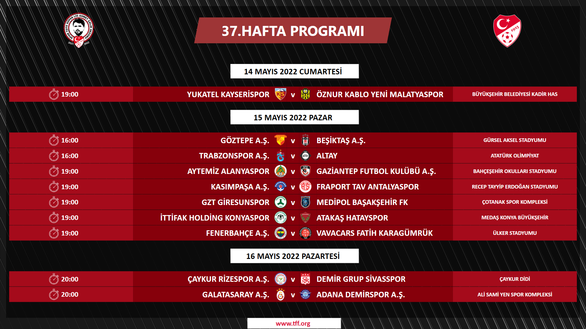 Ligler » Trendyol Süper Lig » Süper Lig Haberleri Spor Toto Süper Lig 37. hafta programı açıklandı 9.05.2022 Spor Toto Süper Lig Ahmet Çalık Sezonu 37. hafta müsabaka programı açıklandı. 37. hafta karşılaşma programı şöyle: Diğer Haberler Haftanın Programı Trendyol Süper Lig Mehmet Ali Yılmaz Sezonu İlk Yarı İstatistikleri Trendyol Süper Lig'de 18-19. Hafta Programı Açıklandı Trendyol Süper Lig'de 17. Hafta 20-22 Aralık Müsabaka Görevlileri Açıklandı Trendyol Süper Lig'de 17. Haftanın 19 Aralık Müsabaka Görevlileri Açıklandı 2025-2026 Sezonu 2. Transfer ve Tescil Dönemi'nde Değişiklik Trendyol Süper Lig'de 16. Hafta Müsabaka Görevlileri Açıklandı Trendyol Süper Lig'de 17. Hafta Programı Açıklandı Trendyol Süper Lig'de 15. Hafta Müsabaka Görevlileri Açıklandı Trendyol Süper Lig'de 14. Hafta Müsabaka Görevlileri Açıklandı