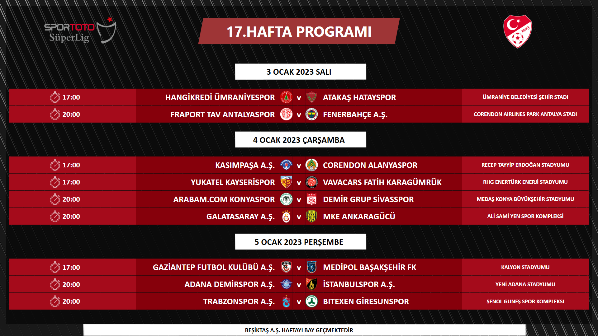 19 - 25. hafta müsabakalarına ilişkin program, Ziraat Türkiye Kupası Son 16 Turu eşleşmeleri sonrası, kalan haftalar ise Ziraat Türkiye Kupası Çeyrek Final ve Yarı Final eşleşmeleri ve takımlarımızın Avrupa Kupası maçlarına göre planlanarak ilan edilecektir.