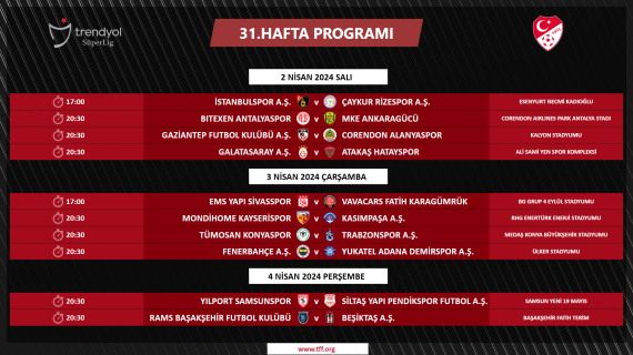 Trendyol Süper Lig'de 31. hafta müsabakalarına ilişkin program belli oldu. Sezon başında ilan edildiği üzere, 31 Mart 2024 Pazar günü yapılacak olan Mahalli İdareler Genel Seçimi sebebiyle 31. Hafta müsabakalarının 2, 3 ve 4 Nisan tarihlerinde oynanması planlanmıştır.