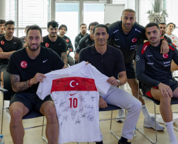 Takım kaptanımız Hakan Çalhanoğlu, sunumun ardından Gözübüyük'e A Millî Takım oyuncularının imzaladığı bir forma hediye etti.