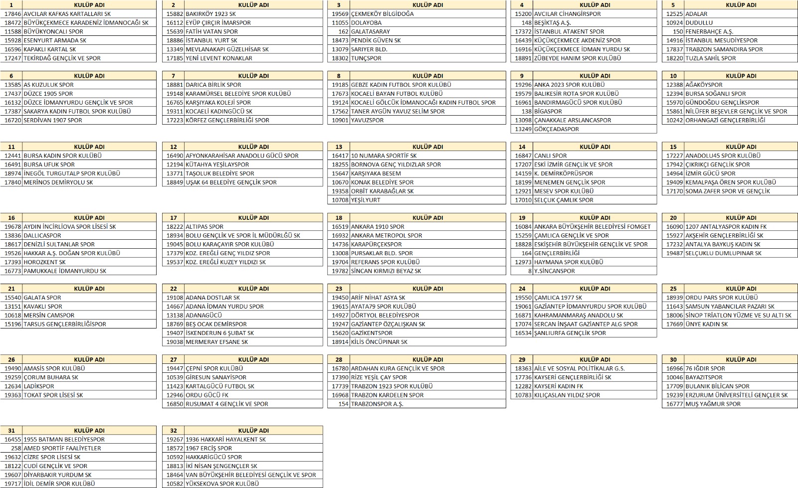 U17 Kızlar Gelişim Ligi 10 Ocak'ta Başlayacak 12.12.2025 U17 Kızlar Gelişim Ligi'nde 2025-2026 sezonu planlaması belli oldu. U17 Kızlar Gelişim Ligi'nin başlangıç tarihi 5 ve 6'lı gruplar için 10 Ocak, 4'lü gruplar için ise 17 Ocak olarak belirlenmiştir. Düzenlemeye göre; U17 Kızlar Gelişim Ligi coğrafi dağılıma ve illerdeki takım sayısına göre 32 grupta oynanacak. Cumartesi günü oynanması planlanan ligde müsabakalar çift devre lig usulünde gerçekleştirilecek. 2025-2026 Sezonu TFF U17 Kızlar Gelişim Ligi Genel Esasları için tıklayınız TFF U17 Kızlar Gelişim Ligi Grupları için tıklayınız TFF U17 Kızlar Gelişim Ligi Maç Haftaları için tıklayınız TFF U17 Kızlar Gelişim Ligi 1. Grup Play-off Yol Haritası için tıklayınız TFF U17 Kızlar Gelişim Ligi 2. Grup Play-off Yol Haritası için tıklayınız TFF U17 Kızlar Gelişim Ligi 3. Grup Play-off Yol Haritası için tıklayınız TFF U17 Kızlar Gelişim Ligi 4. Grup Play-off Yol Haritası için tıklayınız Diğer Haberler Kadın Futbol Liglerinde Haftanın Sonuçları Kadın Futbol Liglerinde Haftanın Programı Kadın Futbol Liglerinde Haftanın Sonuçları Kadın Futbol Liglerinde Haftanın Programı U17 Kızlar Gelişim Ligi Fikstürü Belli Oldu Kadın Futbol Liglerinde Haftanın Sonuçları Kadın Futbol Liglerinde Haftanın Sonuçları Kadın Futbol Liglerinde Haftanın Programı Kadın Futbol Liglerinde Haftanın Sonuçları Kadın Futbol Liglerinde Haftanın Programı [ «« ] [ « ]1 - 2 - 3 - 4 - 5 - 6 - 7 - 8 - 9 - 10[ » ] [ »» ]