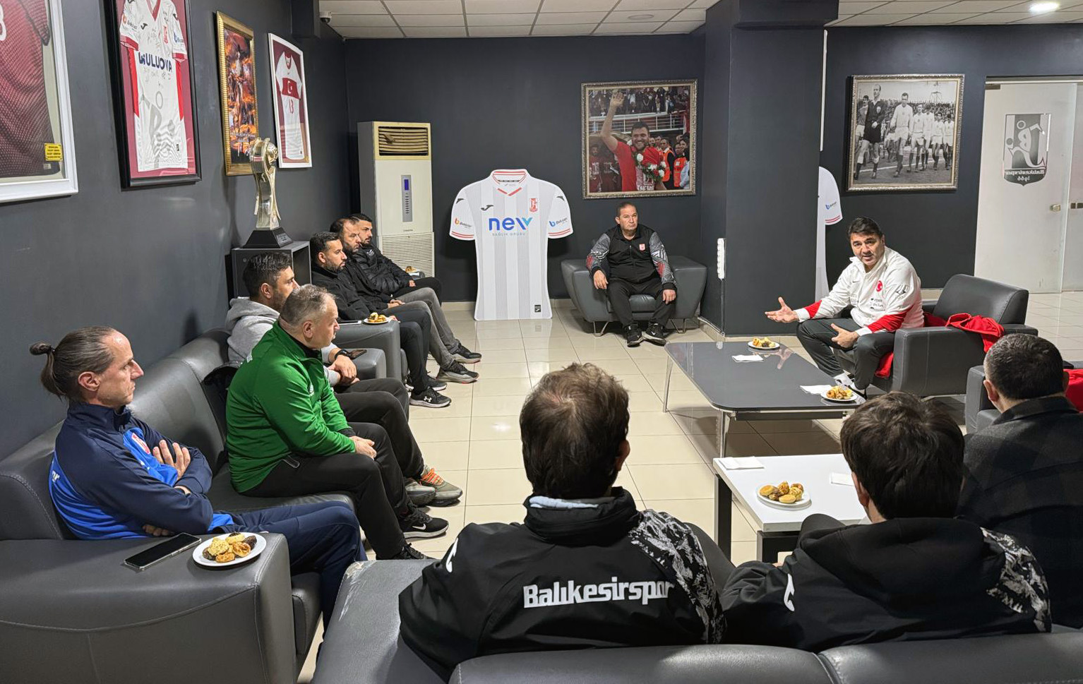İlk olarak Nev Sağlık Grubu Balıkesirspor Kulübü'nü ziyaret eden Bayraktar ve Çam, altyapı koordinatörü Ahmet Gürkan Şehirli ile kulüp altyapısında görev yapan alt yaş grubu antrenörleriyle bir araya geldiler.