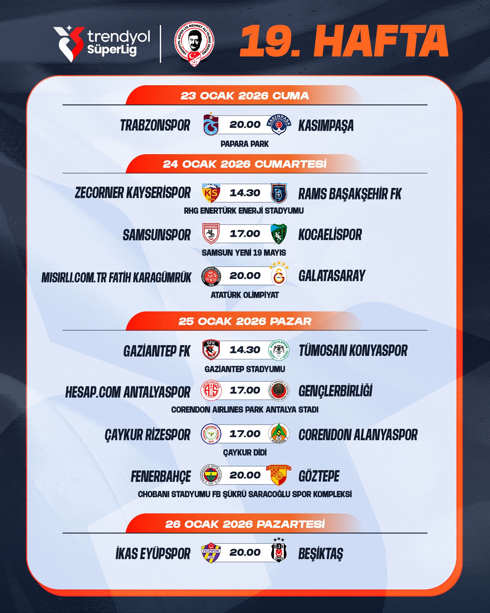Ligler » Trendyol Süper Lig » Süper Lig Haberleri Trendyol Süper Lig'de 18-19. Hafta Programı Açıklandı 22.12.2025 Trendyol Süper Lig Mehmet Ali Yılmaz Sezonu 18 - 19. hafta müsabakalarına ilişkin program açıklanmıştır.Saha bilgisi boş bırakılmış müsabakanın hangi stadyumda oynanacağı daha sonra ilan edilecektir.Karşılaşmaların programı şöyle: Diğer Haberler Haftanın Programı Trendyol Süper Lig'de 17. Hafta 20-22 Aralık Müsabaka Görevlileri Açıklandı Trendyol Süper Lig'de 17. Haftanın 19 Aralık Müsabaka Görevlileri Açıklandı 2025-2026 Sezonu 2. Transfer ve Tescil Dönemi'nde Değişiklik Trendyol Süper Lig'de 16. Hafta Müsabaka Görevlileri Açıklandı Trendyol Süper Lig'de 17. Hafta Programı Açıklandı Trendyol Süper Lig'de 15. Hafta Müsabaka Görevlileri Açıklandı Trendyol Süper Lig'de 14. Hafta Müsabaka Görevlileri Açıklandı Trendyol Süper Lig'de 13. Hafta Müsabaka Görevlileri Açıklandı Trendyol Süper Lig'de 12. Hafta Müsabaka Görevlileri Açıklandı