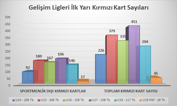 Gelişim Liglerinin U14 - U15 - U16 - U17 ve U19 kategorilerinde ilk devre görülen kırmızı kart sayılarına ilişkin rapor şu şekildedir.