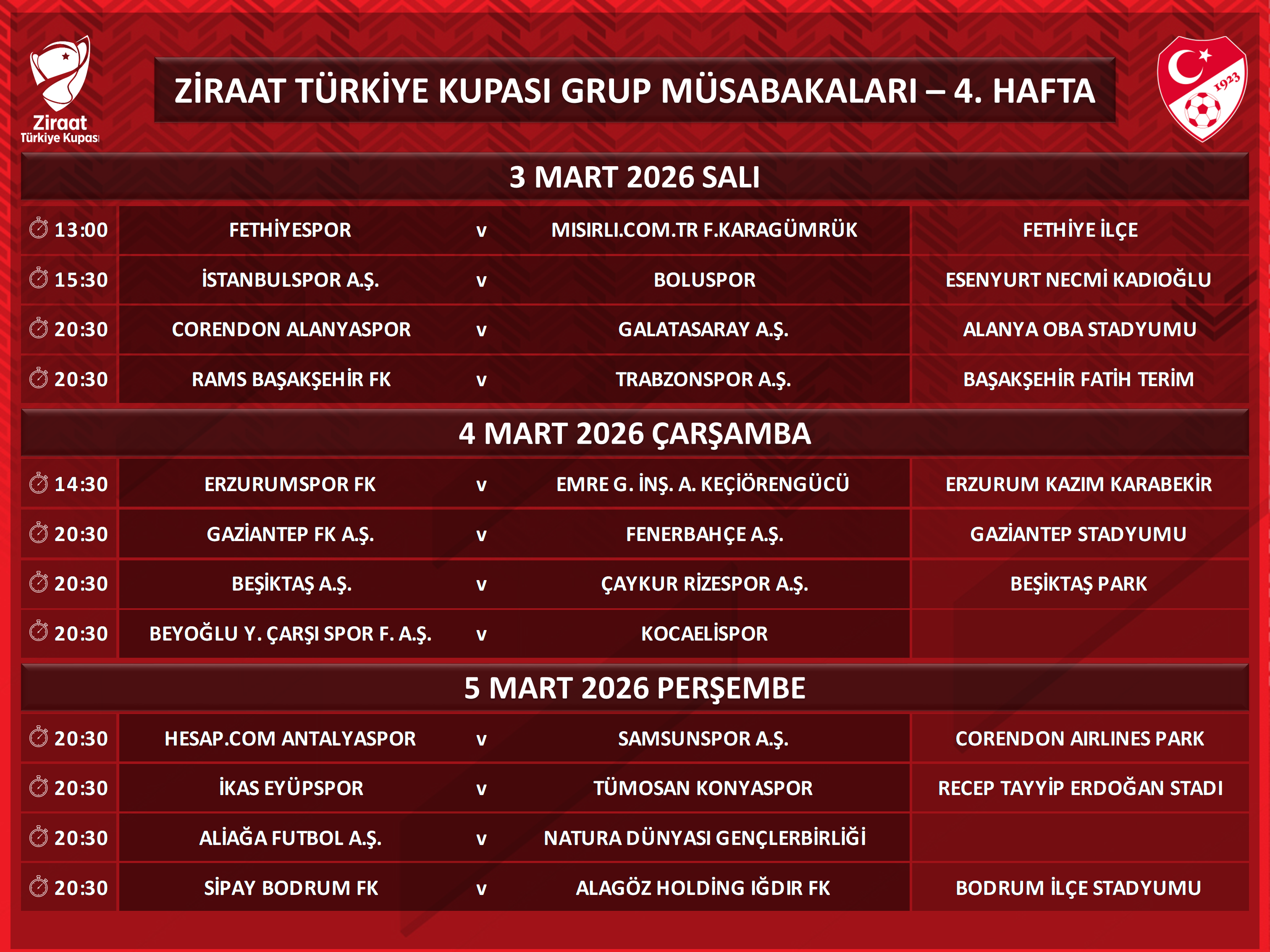 Ziraat Türkiye Kupası Grup 4. Maçlarının Programı Açıklandı 16.02.2026