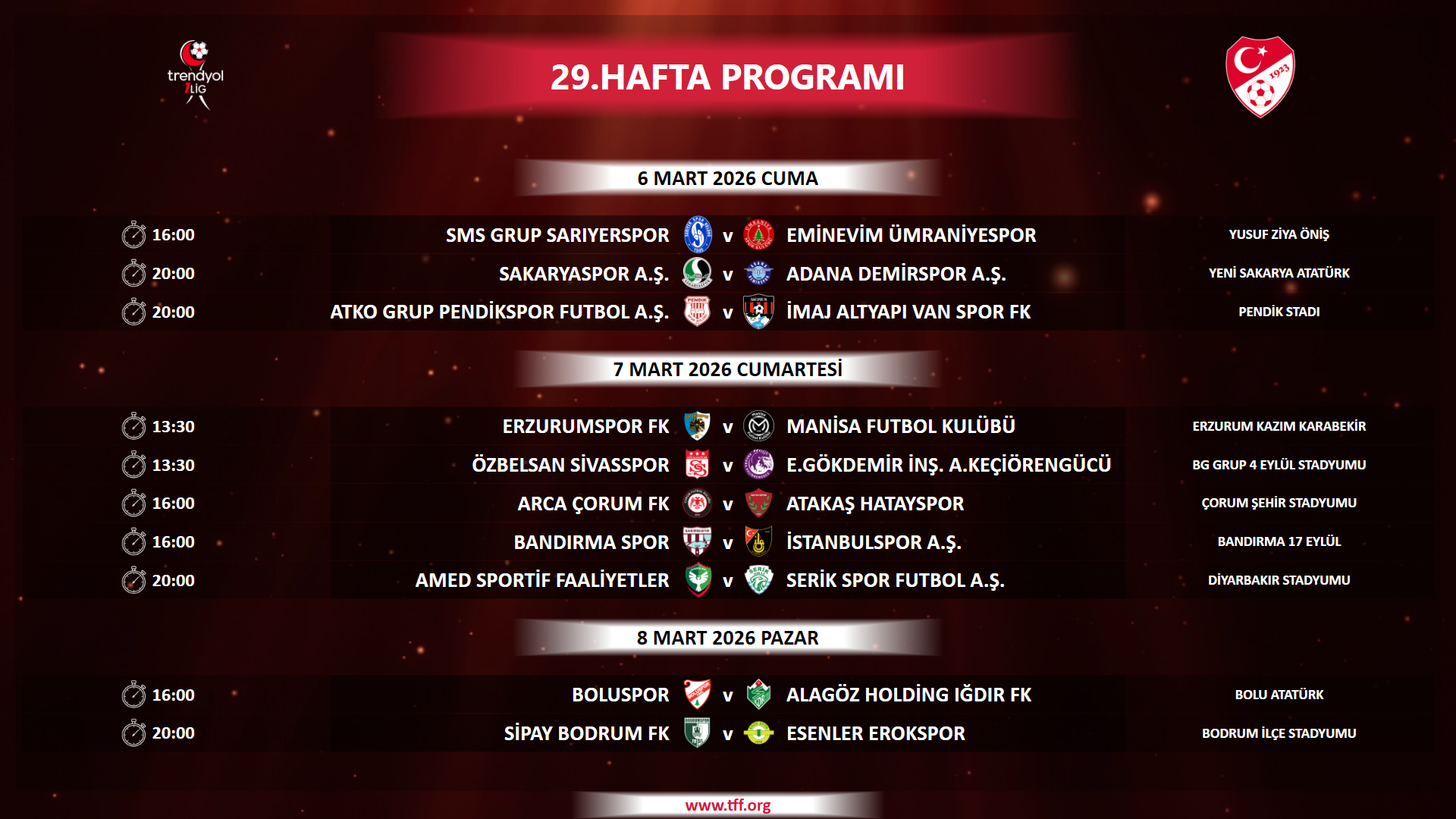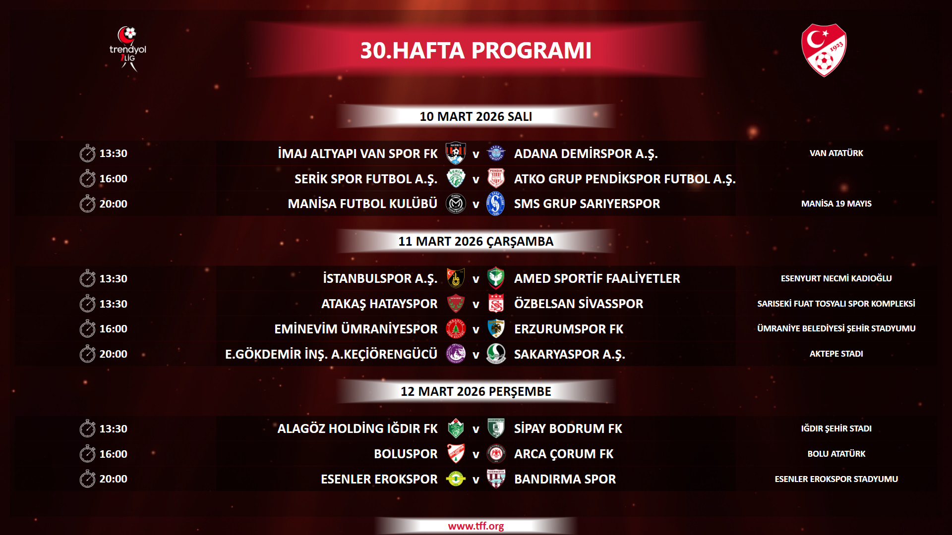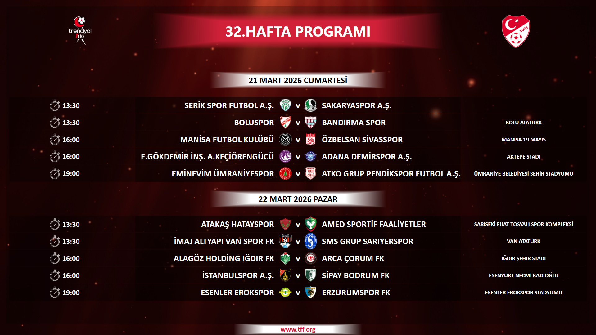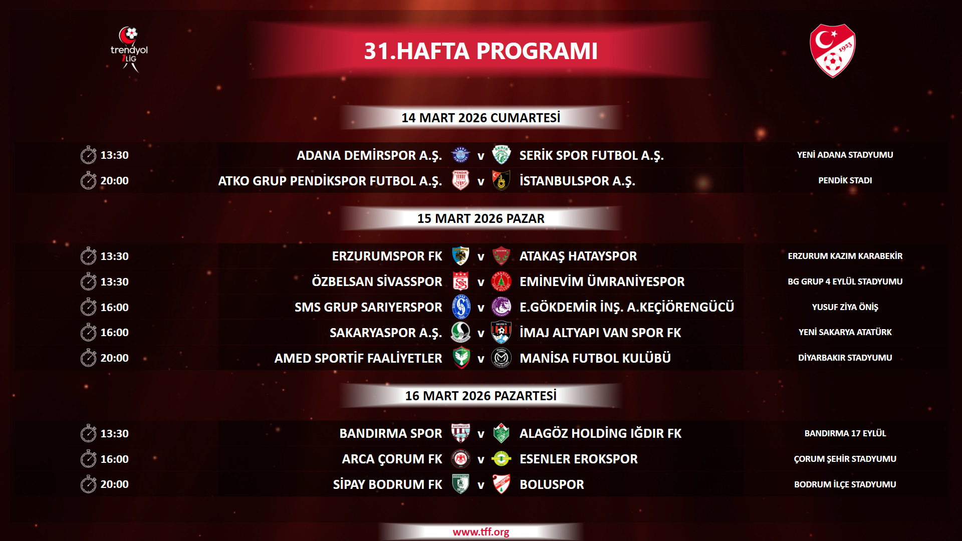 Ramazan Bayramının 1. günü olan 20 Mart Cuma gününe müsabaka planlanmamıştır.
