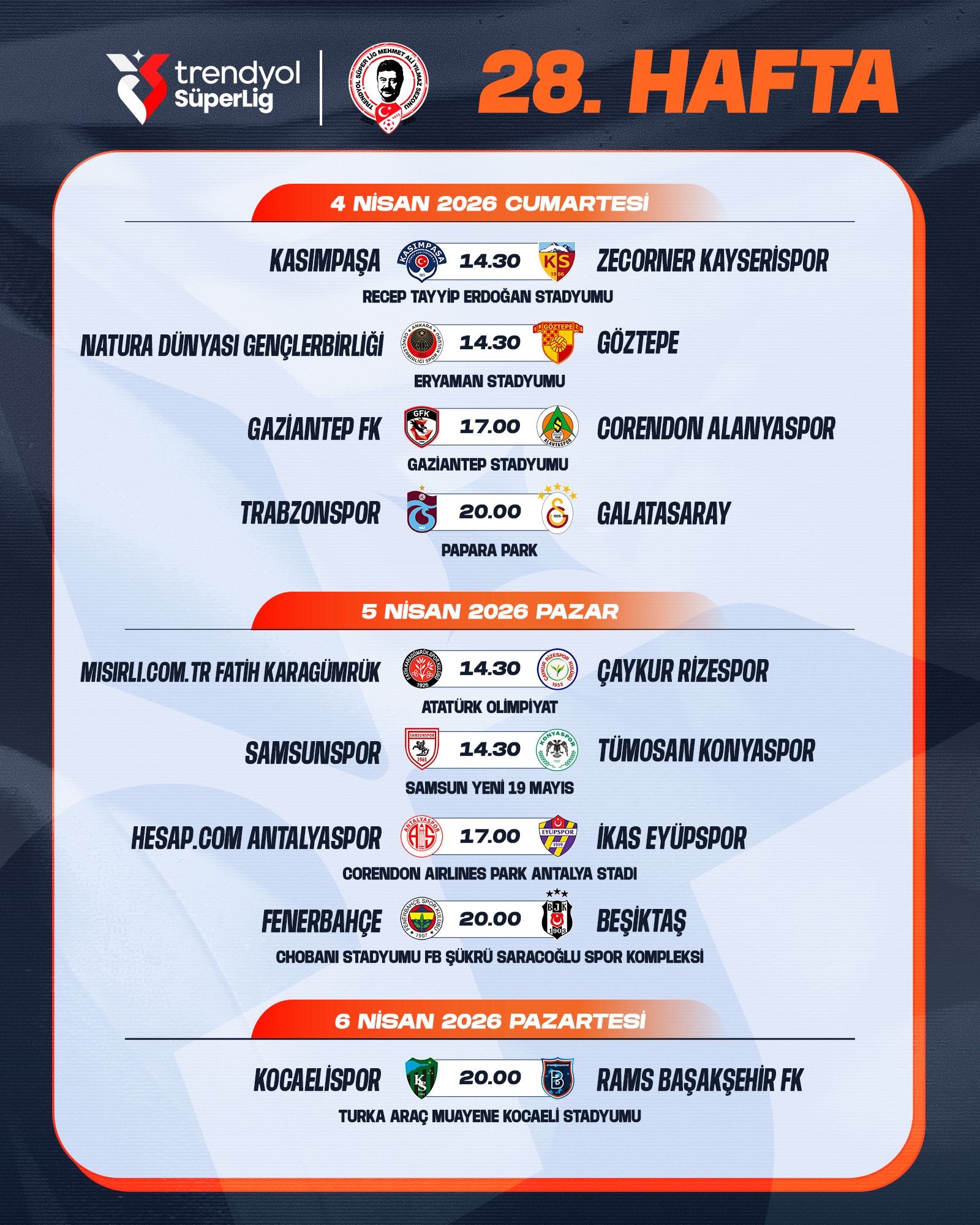 Ligler » Trendyol Süper Lig » Süper Lig Haberleri Trendyol Süper Lig'de 28. Hafta Programı Açıklandı 20.03.2026 Trendyol Süper Lig Mehmet Ali Yılmaz Sezonu 28. hafta müsabakalarına ilişkin program açıklanmıştır.Karşılaşmaların programı şöyle: Diğer Haberler Haftanın Programı Trendyol Süper Lig'de 26. Haftanın 14 ve 15 Mart Müsabaka Görevlileri Açıklandı Trendyol Süper Lig'de 26. Haftanın 13 Mart Müsabaka Görevlileri Açıklandı Trendyol Süper Lig'de AVAR Değişikliği Trendyol Süper Lig'de 25. Haftanın 8-9 Mart Müsabaka Görevlileri Açıklandı Profesyonel Liglerde 2026-2027 Sezonu Başlangıç Tarihleri Belli Oldu Trendyol Süper Lig'de 25. Haftanın 7 Mart Müsabaka Görevlileri Açıklandı Trendyol Süper Lig'de 26-27. Hafta Programları Açıklandı Trendyol Süper Lig'de Temsilci Değişikliği Trendyol Süper Lig'de 24. Hafta Müsabaka Görevlileri Açıklandı