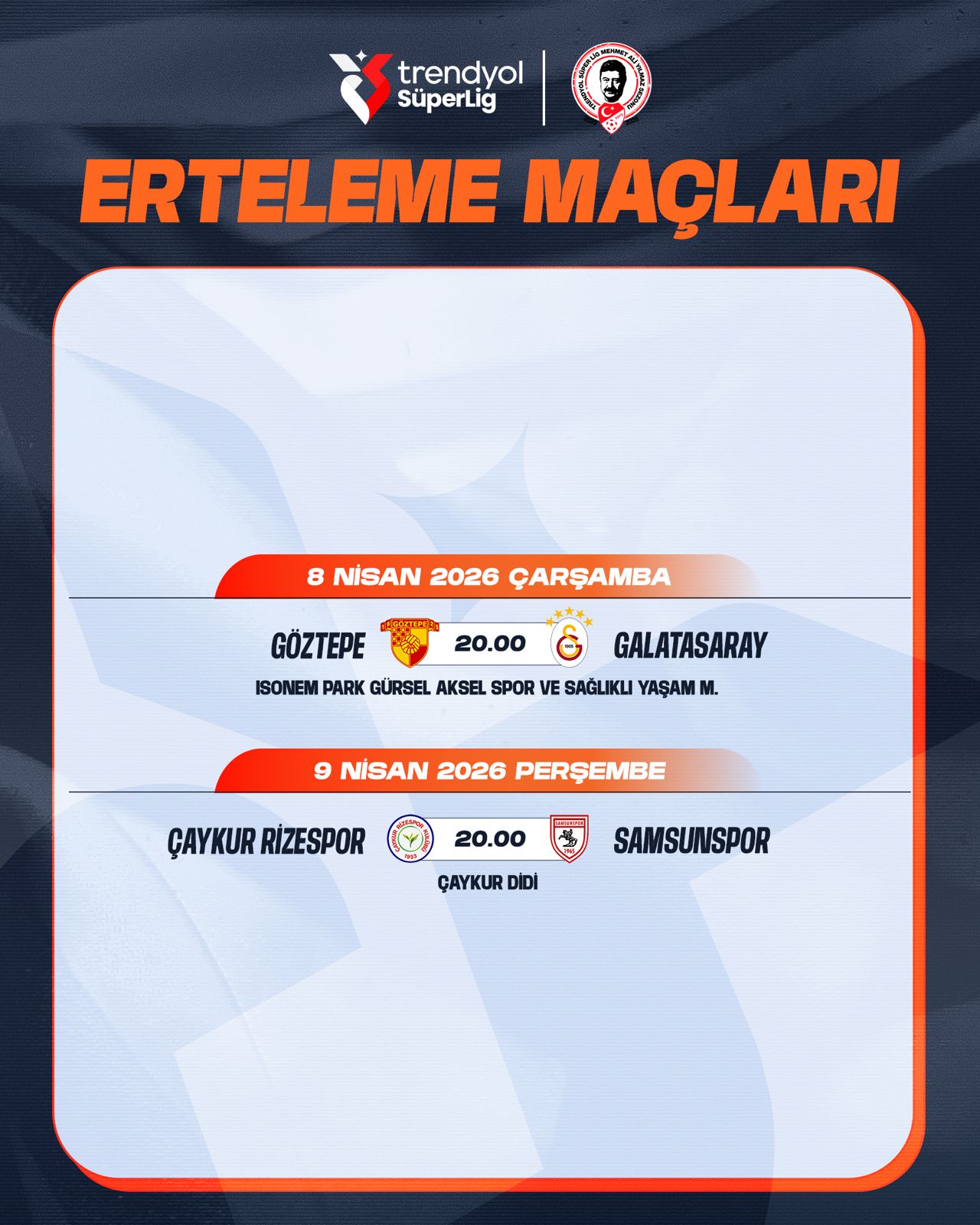 Ligler » Trendyol Süper Lig » Süper Lig Haberleri Trendyol Süper Lig'de 27. Hafta Erteleme Maçlarının Programı Açıklandı 20.03.2026 Trendyol Süper Lig Mehmet Ali Yılmaz Sezonu 27. hafta erteleme müsabakalarına ilişkin program açıklanmıştır.Karşılaşmaların programı şöyle: Diğer Haberler Trendyol Süper Lig'de 28. Hafta Programı Açıklandı Haftanın Programı Trendyol Süper Lig'de 26. Haftanın 14 ve 15 Mart Müsabaka Görevlileri Açıklandı Trendyol Süper Lig'de 26. Haftanın 13 Mart Müsabaka Görevlileri Açıklandı Trendyol Süper Lig'de AVAR Değişikliği Trendyol Süper Lig'de 25. Haftanın 8-9 Mart Müsabaka Görevlileri Açıklandı Profesyonel Liglerde 2026-2027 Sezonu Başlangıç Tarihleri Belli Oldu Trendyol Süper Lig'de 25. Haftanın 7 Mart Müsabaka Görevlileri Açıklandı Trendyol Süper Lig'de 26-27. Hafta Programları Açıklandı Trendyol Süper Lig'de Temsilci Değişikliği