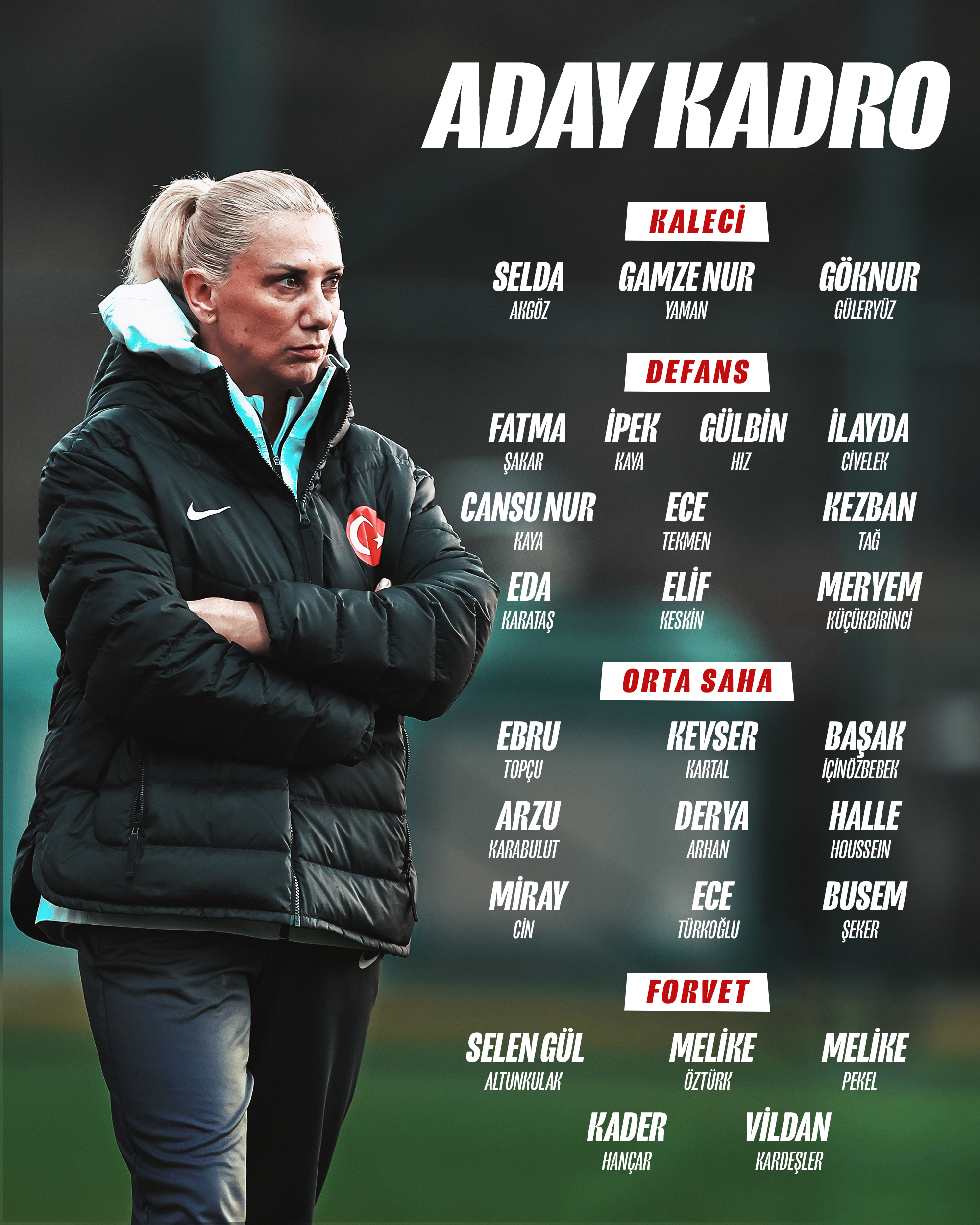 Forvet: Selen Gül Altunkulak (FC Toulouse), Melike Öztürk, Melike Pekel (Galatasaray GAİN), Kader Hançar (Club Tijuana), Vildan Kardeşler (Hamburg SV)