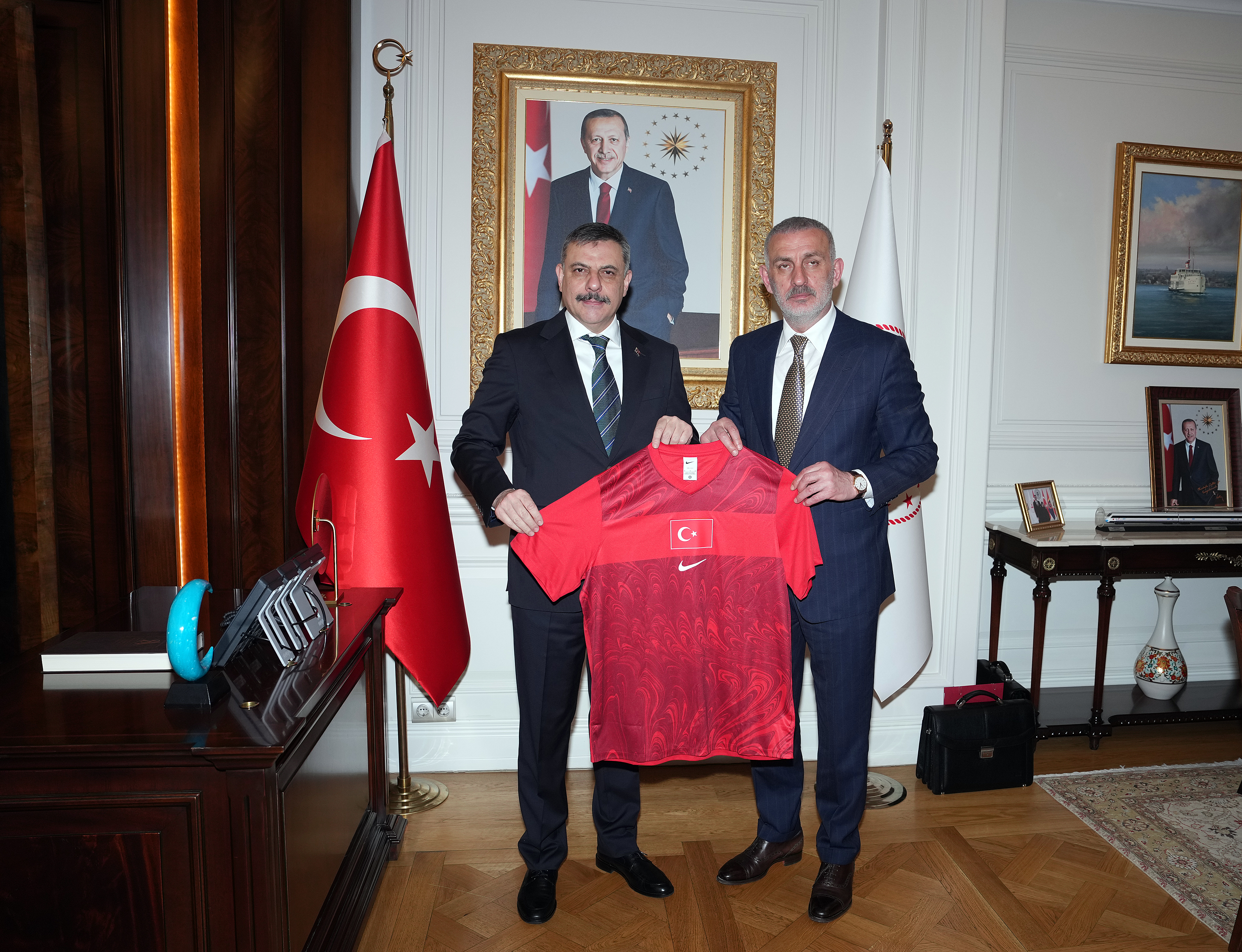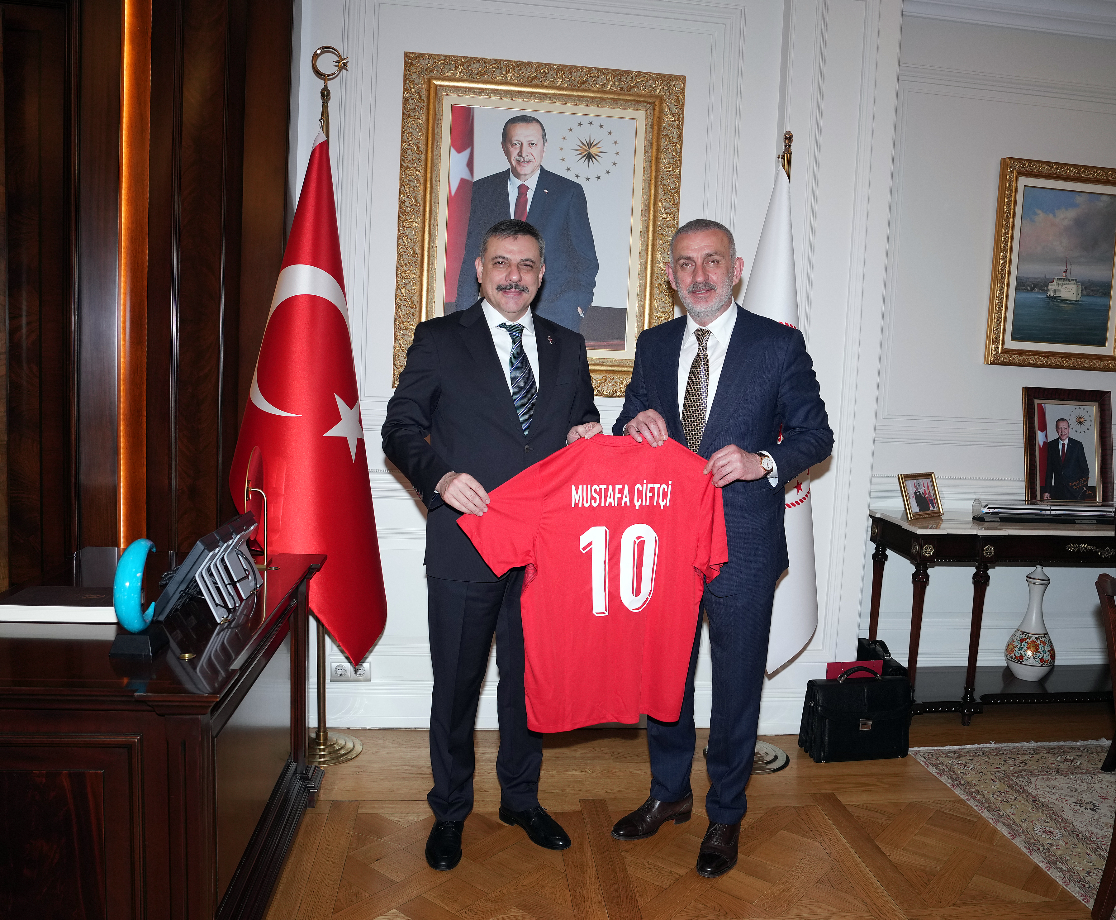Misafirperverliği için Bakan Çiftçi'ye teşekkür ederek çalışmalarında başarılar dileyen TFF Başkanı Hacıosmanoğlu, kendisine üzerinde isminin yazılı olduğu bir A Millî Takım forması ve bir plaket takdim etti.