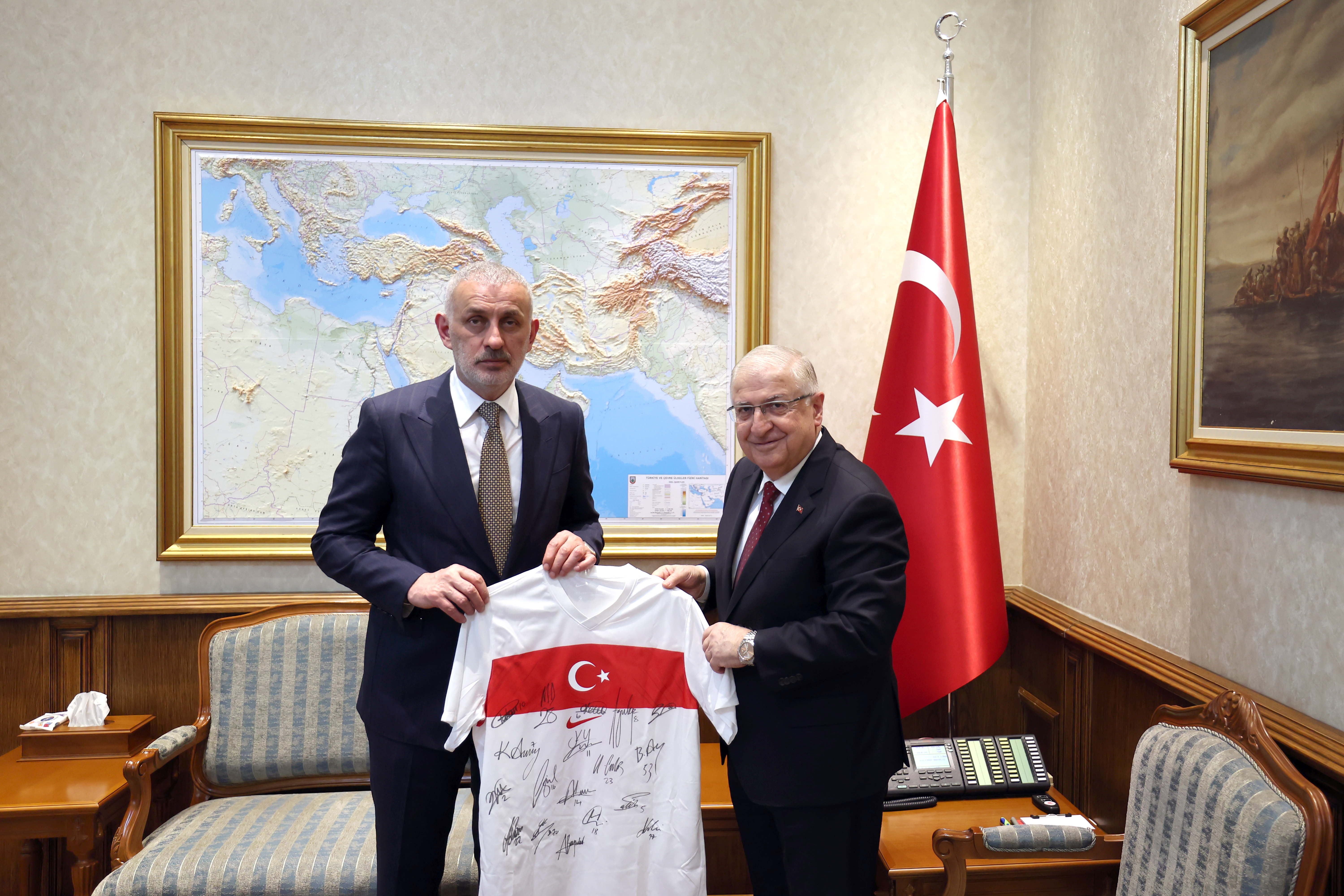 Misafirperverliği için Bakan Güler'e teşekkür ederek çalışmalarında başarılar dileyen TFF Başkanı Hacıosmanoğlu, kendisine üzerinde isminin yazılı olduğu imzalı bir A Millî Takım forması takdim etti.