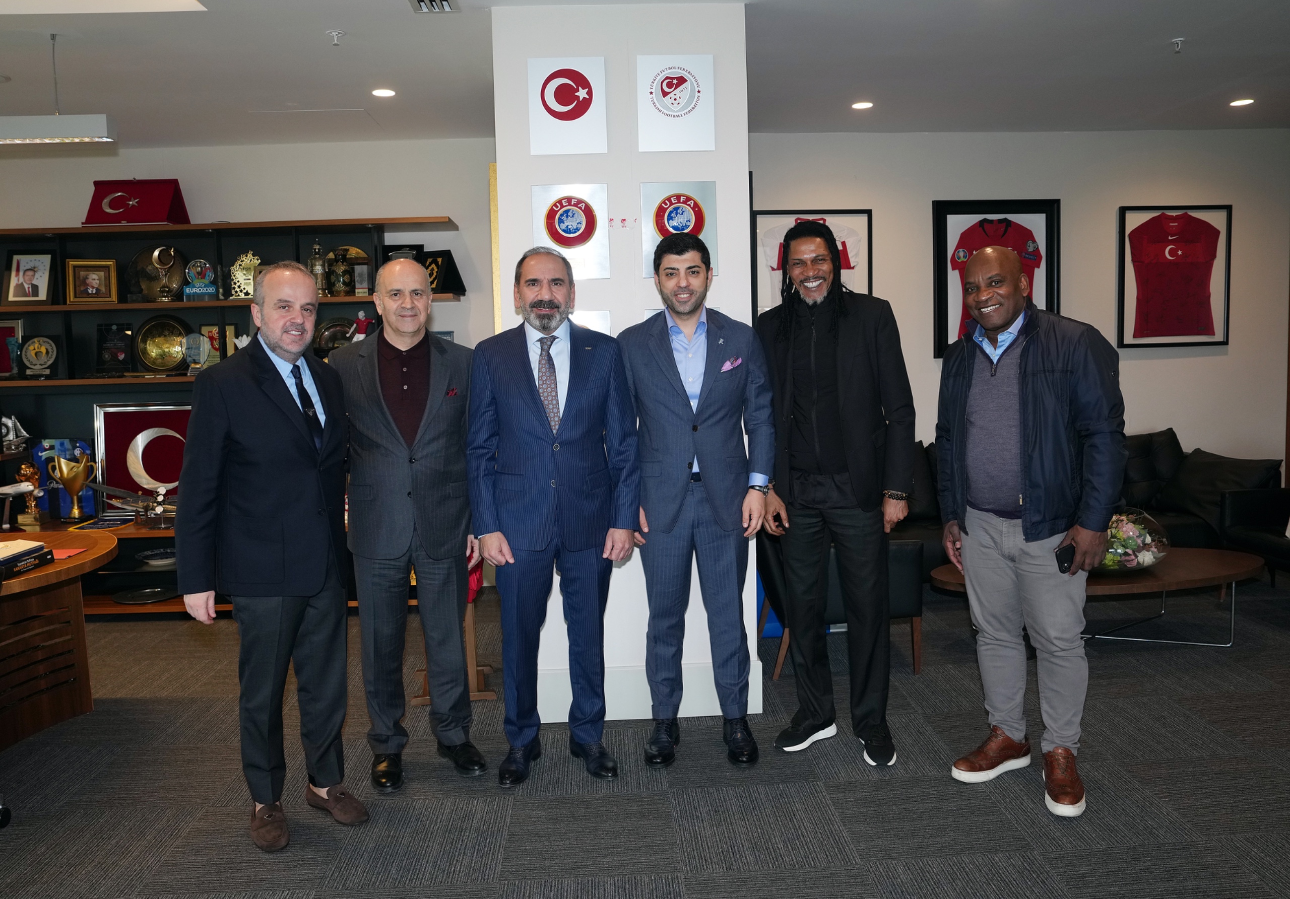 Galatasaray ve Trabzonspor'da da forma giyen eski futbolcu ve teknik direktör Rigobert Song, Türkiye Futbol Federasyonu Başkanı İbrahim Ethem Hacıosmanoğlu ile TFF Başkan Vekili Mecnun Otyakmaz'ı makamlarında ziyaret etti.
