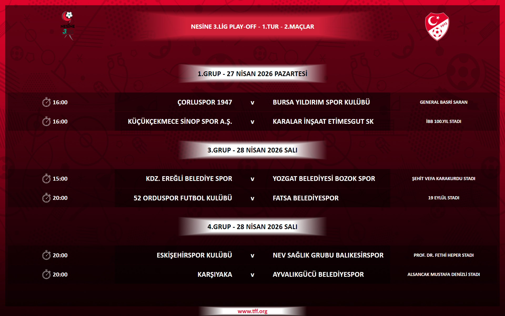 Nesine 3. Lig 2. Grup'ta 18.04.2026 Cumartesi günü oynanması gereken Eti Gübre Mazıdağı Fosfat Spor - Hacettepe A.Ş. Türk Metal 1963 Spor müsabakası, Hacettepe A.Ş. Türk Metal 1963 Spor Kulübü'nün müsabaka kıyafeti ile belirlenen ve ilan olunan saatte sahaya gelmemesi nedeniyle müsabaka hakemi tarafından tatil edilmiştir. Bu sebeple, Nesine 3. Lig 2. Grup Play-Off Müsabaka Programı, anılan müsabaka ile ilgili disiplin süreçlerinin tamamlanmasından sonra ilan edilecektir.