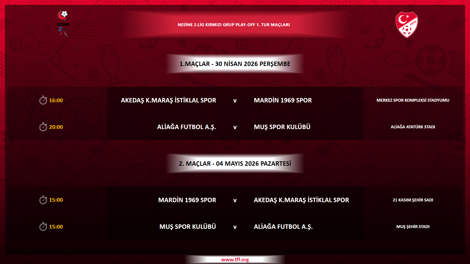 Nesine 2. Lig Play-Off 1. Tur Programları Açıklandı 25.04.2026 Nesine 2. Lig play-off 1. tur müsabakalarına ilişkin programlar açıklanmıştır.Karşılaşmaların programları şöyle: Diğer Haberler Haftanın Programı Nesine 2. Lig'de Haftanın Canlı Yayınlanacak Maçları Belirlendi Nesine 2. Lig'de Haftanın Müsabaka Görevlileri Açıklandı Nesine 2. Lig'e Yükselen Kütahyaspor Futbol Spor Kulübü Kupasını Aldı Bursaspor, Trendyol 1. Lig'e Yükseldi Nesine 2. Lig'e Yükselen Sebat Gençlik Spor Kupasını Aldı İnegöl Kafkas Spor Kulübü, Nesine 2. Lig'e Yükseldi Nesine 2. Lig'e Yükselen 12 Bingöl Spor, Kupasını Aldı Profesyonel Lig Müsabakaları Öncesinde Saygı Duruşunda Bulunulacak Nesine 2. Lig ve Nesine 3. Lig'de Haftanın Müsabaka Görevlileri Açıklandı
